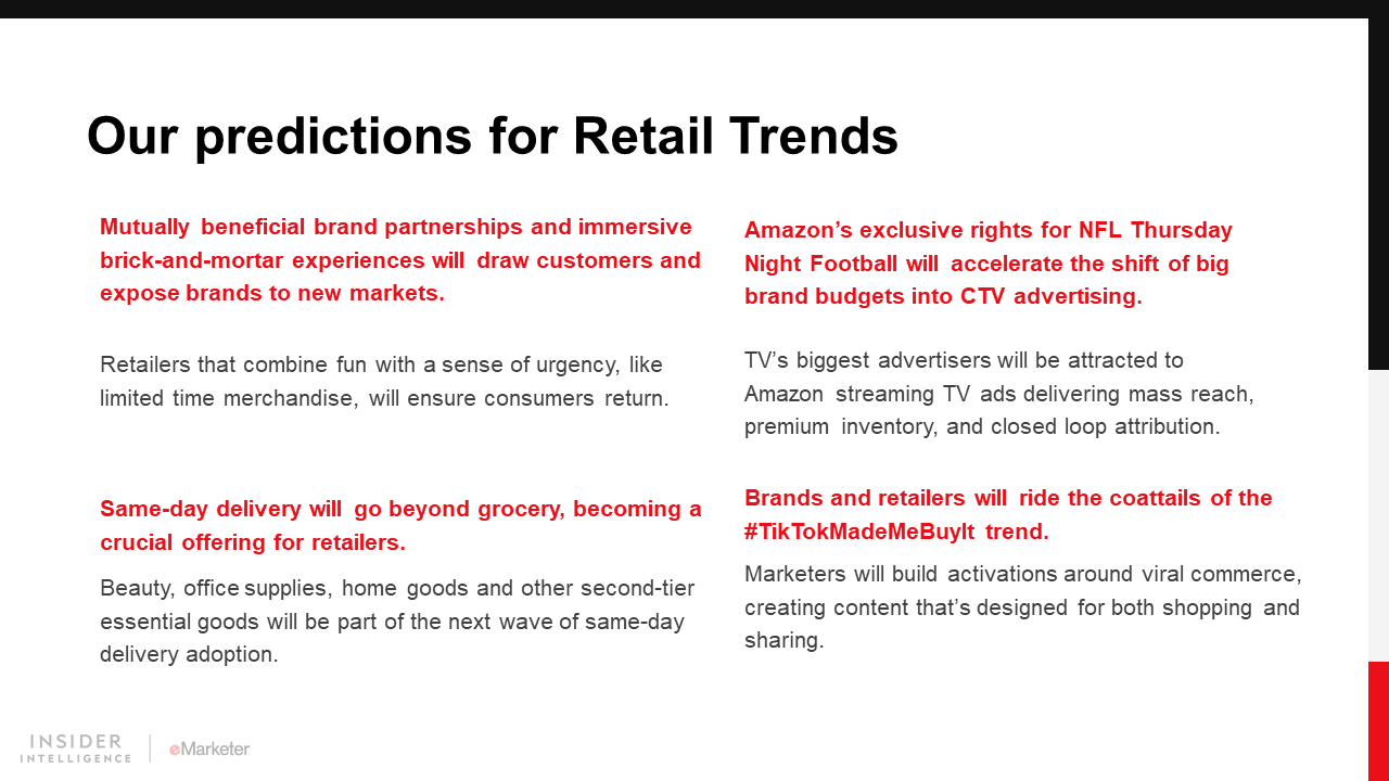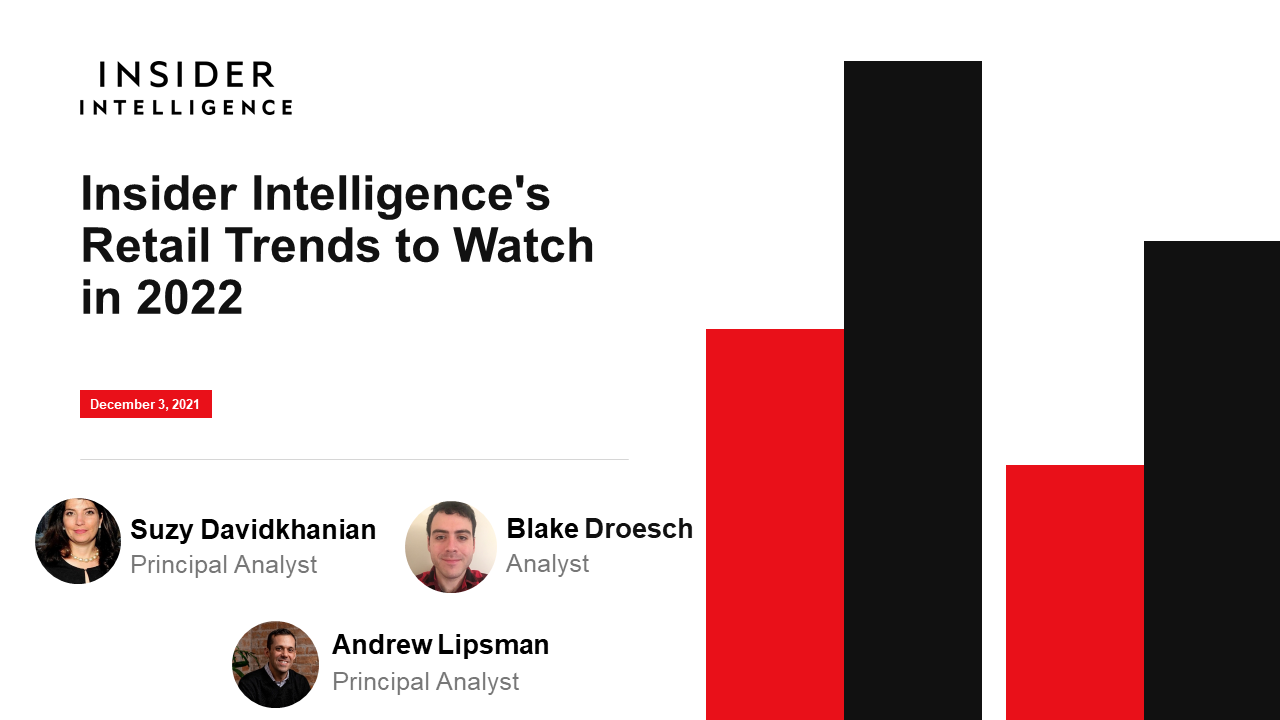 KEY STAT: Total US retail sales will increase 2.5% year over year (YoY) in 2022 to $6.624 trillion. Ecommerce sales will grow 16.1%, while growth for in-store sales—which will account for more than 80% of total retail sales—will be close to flat.
