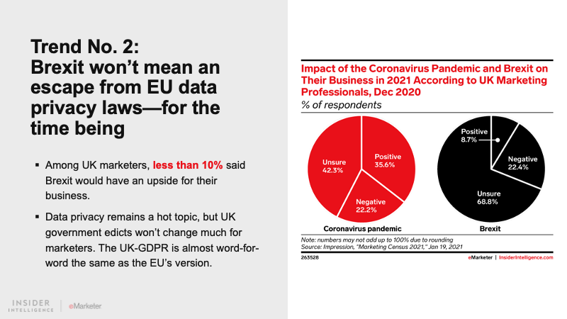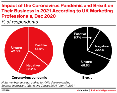 KEY STAT: Some UK marketers said the pandemic would have an upside for their business in 2021, while very few expected the same from Brexit, per December 2020 polling by marketing agency Impression. Significantly more respondents, however, were still unsure about their implications.