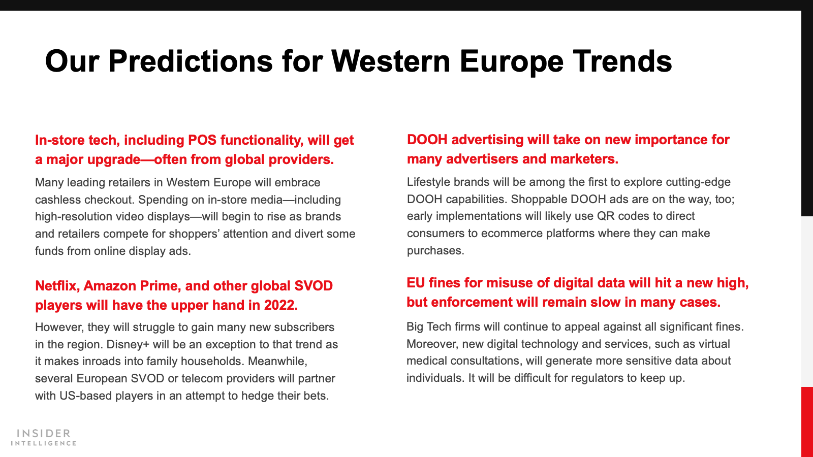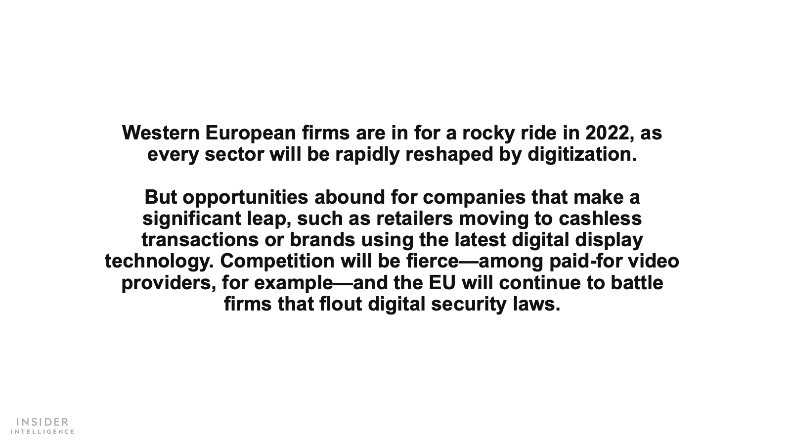 Western European firms are in for a rocky ride in 2022, as every sector will be rapidly reshaped by digitization. But opportunities abound for companies that make a significant leap, such as retailers moving to cashless transactions or brands using the latest digital display technology. Competition will be fierce—among paid-for video providers, for example—and the EU will continue to battle firms that flout digital security laws.