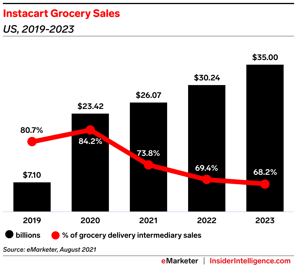 Competitors catch up: While Instacart usage soared during the pandemic, the company no longer controls the third-party delivery market like it used to: We forecast its share of the market will drop to 69.4% this year.