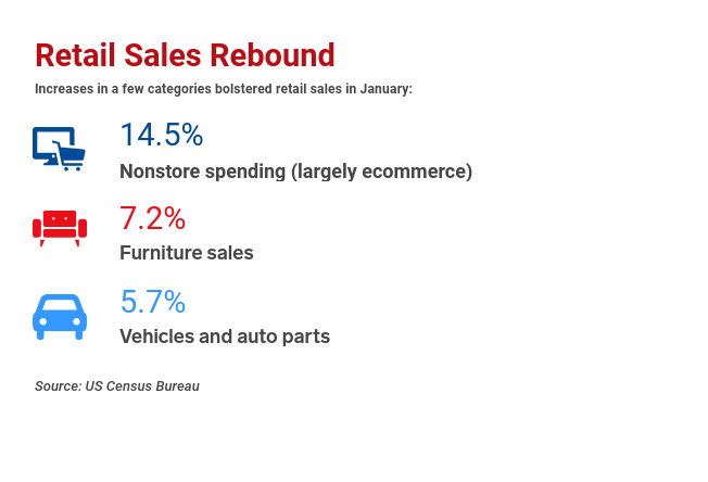 The news: Retail sales in January rose by a seasonally adjusted 3.8% from the prior month, as people in the US bought more cars, furniture, and electronics, per the US Commerce Department’s monthly report. Sales were up 13.0% year over year (YoY).