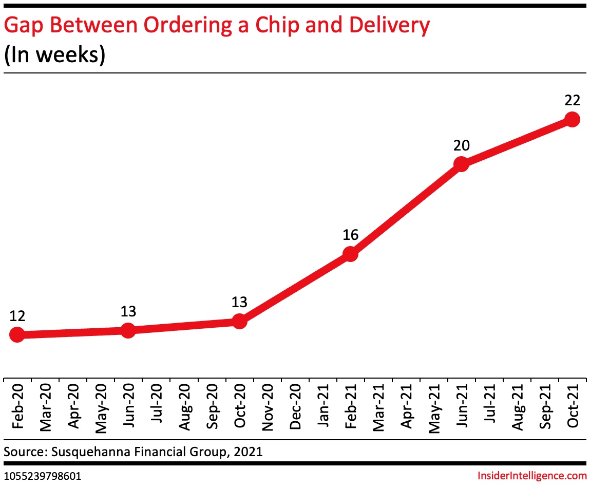 - Chips are being delivered 22 weeks after they are ordered, an all-time high that is expected to continue throughout 2022, potentially extending into 2023.