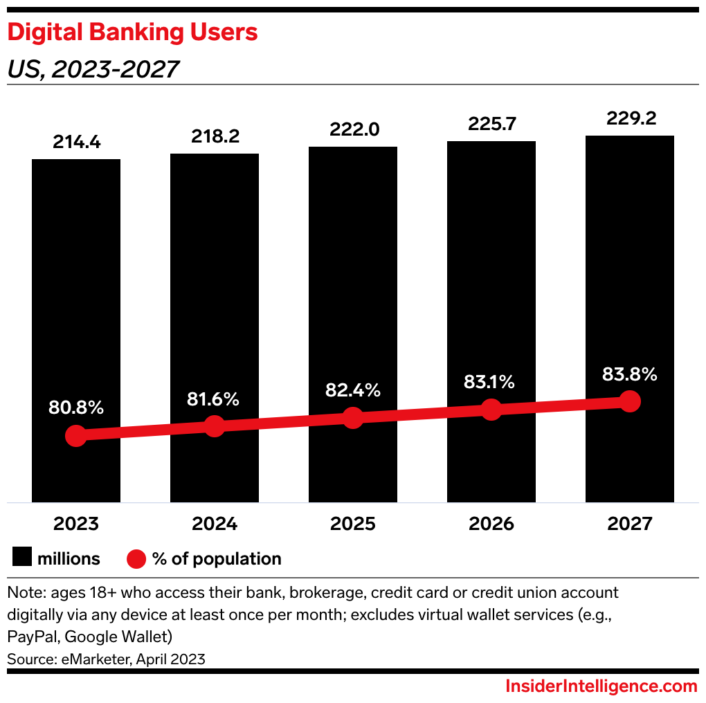 The news: A digital banking experience is table stakes for any financial institution (FI). In the US, nearly 85% of the population is expected to use digital banking by 2027 according to our forecast.