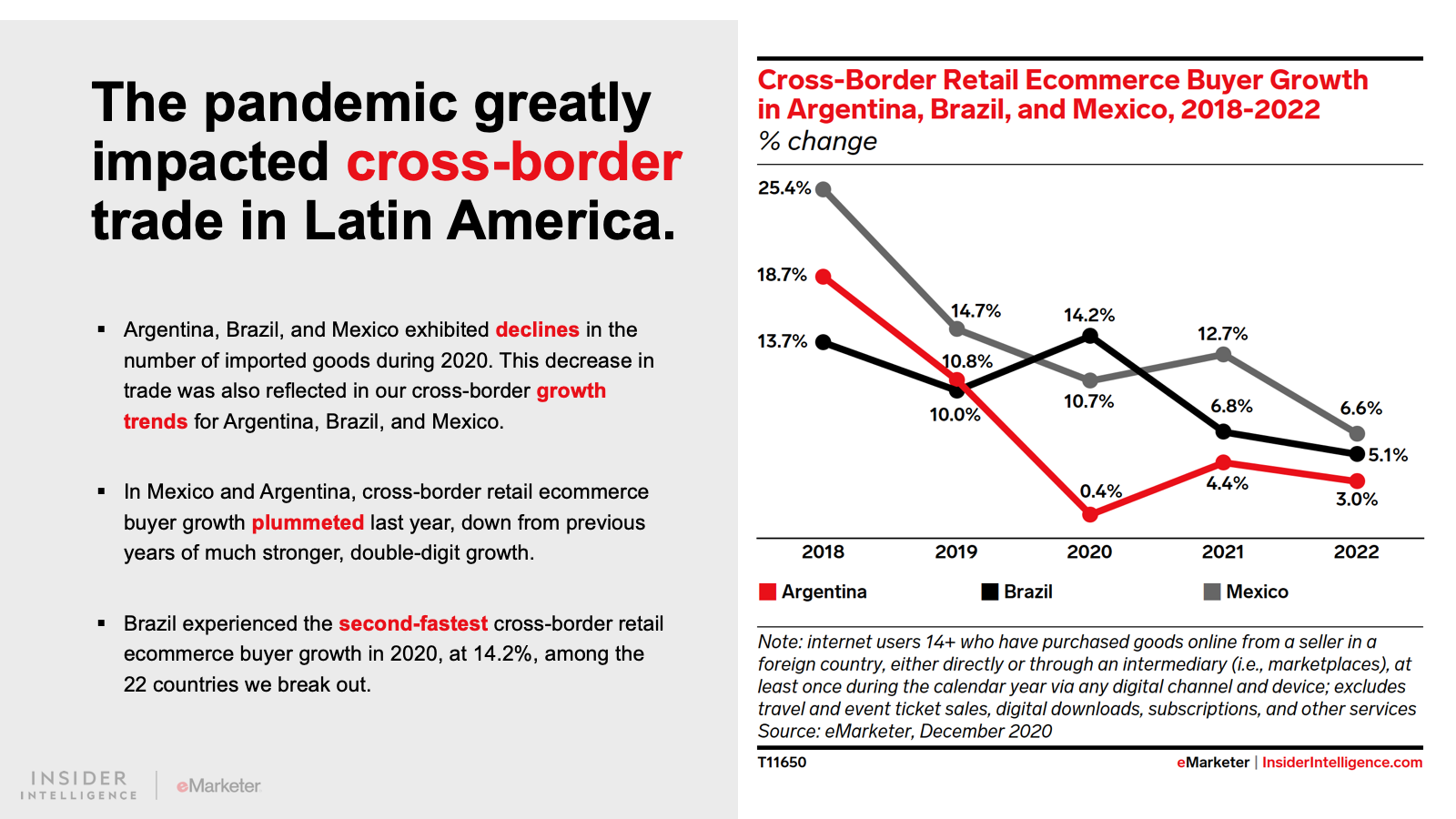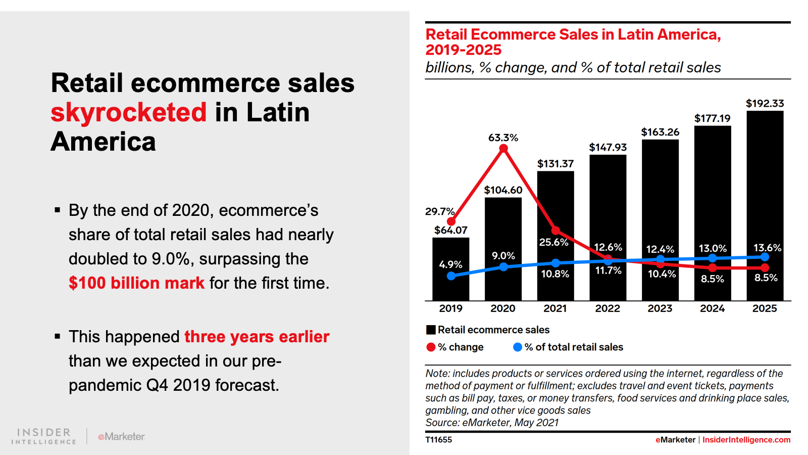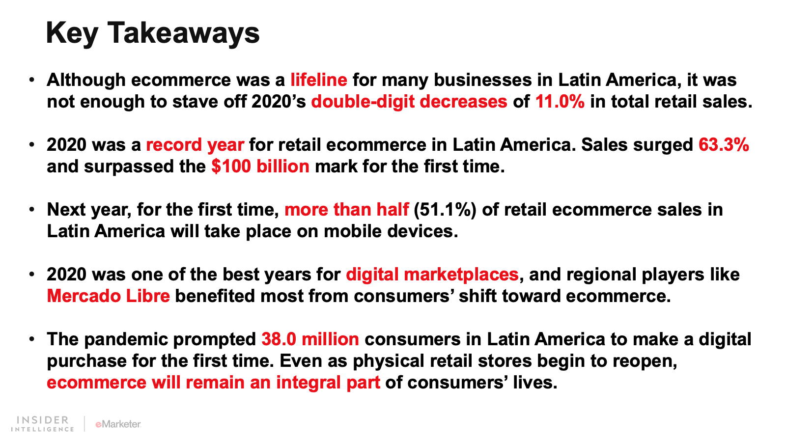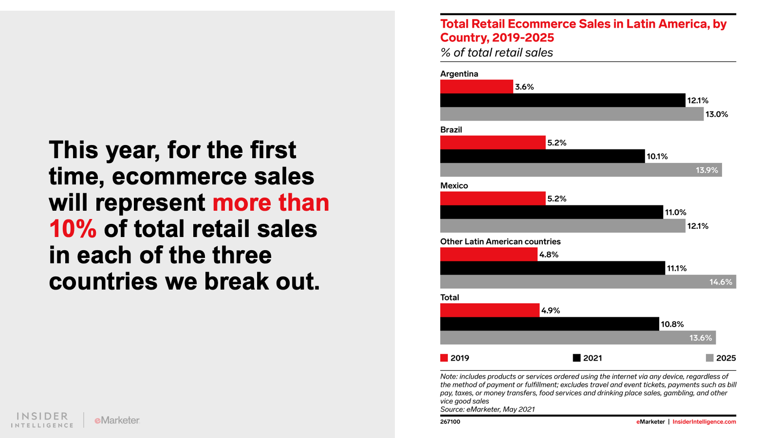 WHAT’S IN THIS REPORT? This report features our latest forecasts for total retail, ecommerce, and mcommerce sales in Latin America, with breakouts for Argentina, Brazil, and Mexico. It also examines key drivers fueling regional market movements in 2021 and beyond.