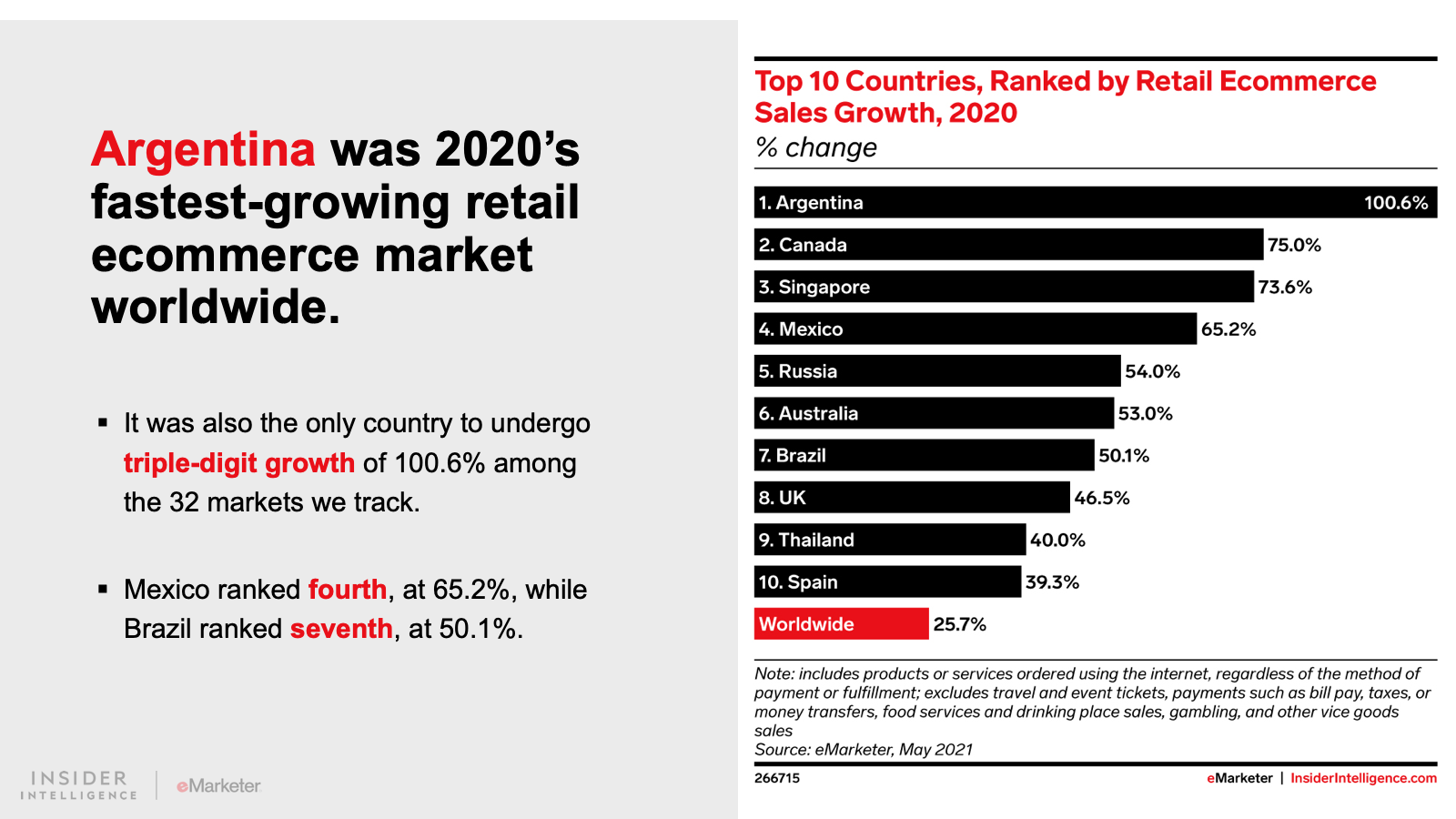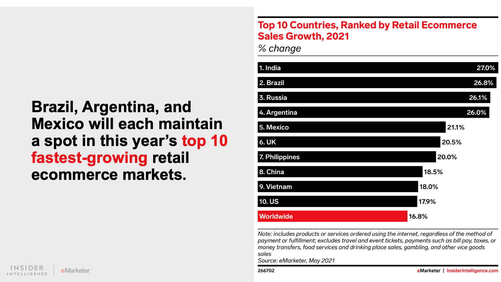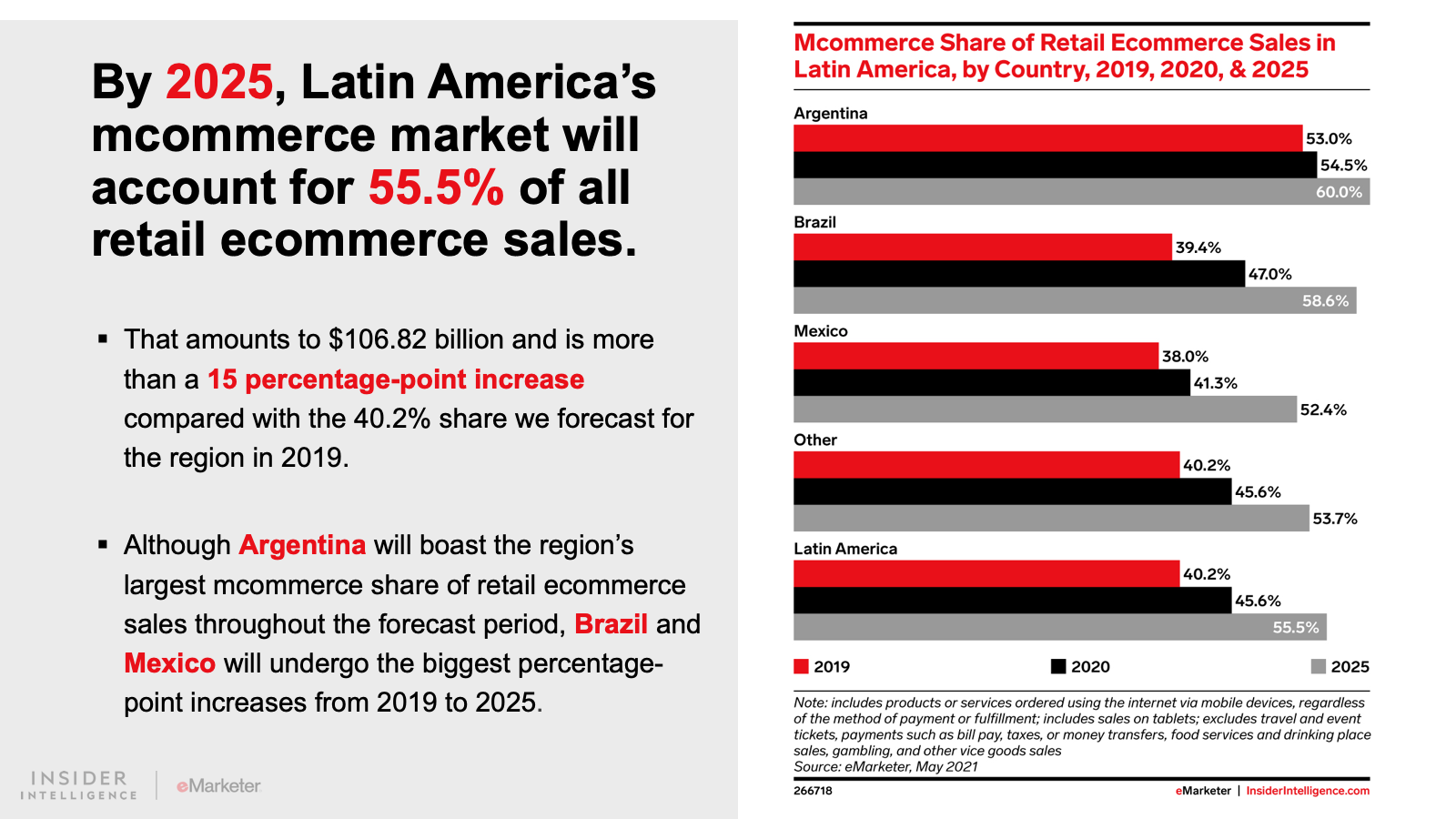 WHAT’S IN THIS REPORT? This report features our latest forecasts for total retail, ecommerce, and mcommerce sales in Latin America, with breakouts for Argentina, Brazil, and Mexico. It also examines key drivers fueling regional market movements in 2021 and beyond.