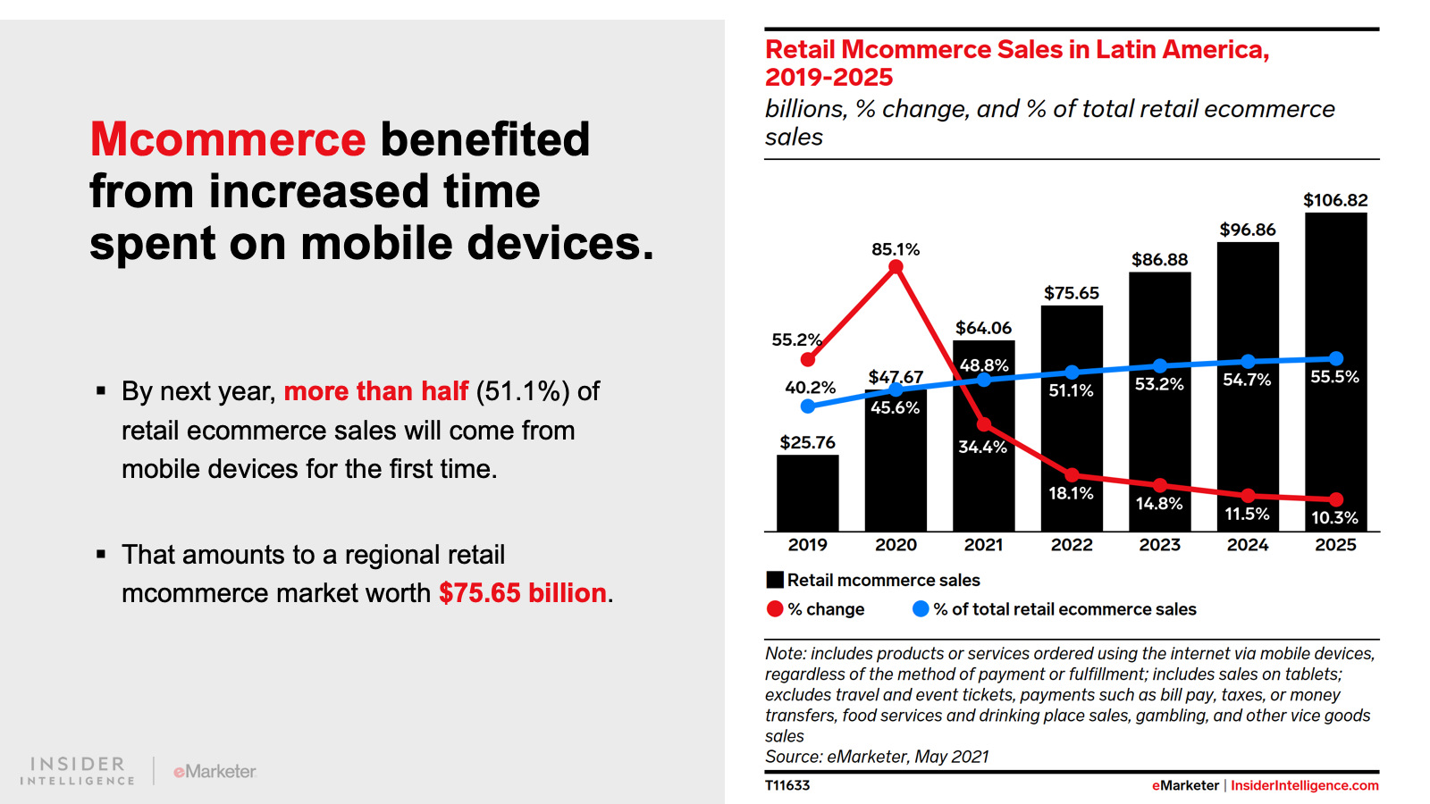 From 2016 to 2019, mobile’s share of retail ecommerce sales in Latin America nearly doubled from 20.9% to 40.2%. This year, we forecast that nearly half (48.8%) of retail ecommerce sales will take place on mobile devices.
