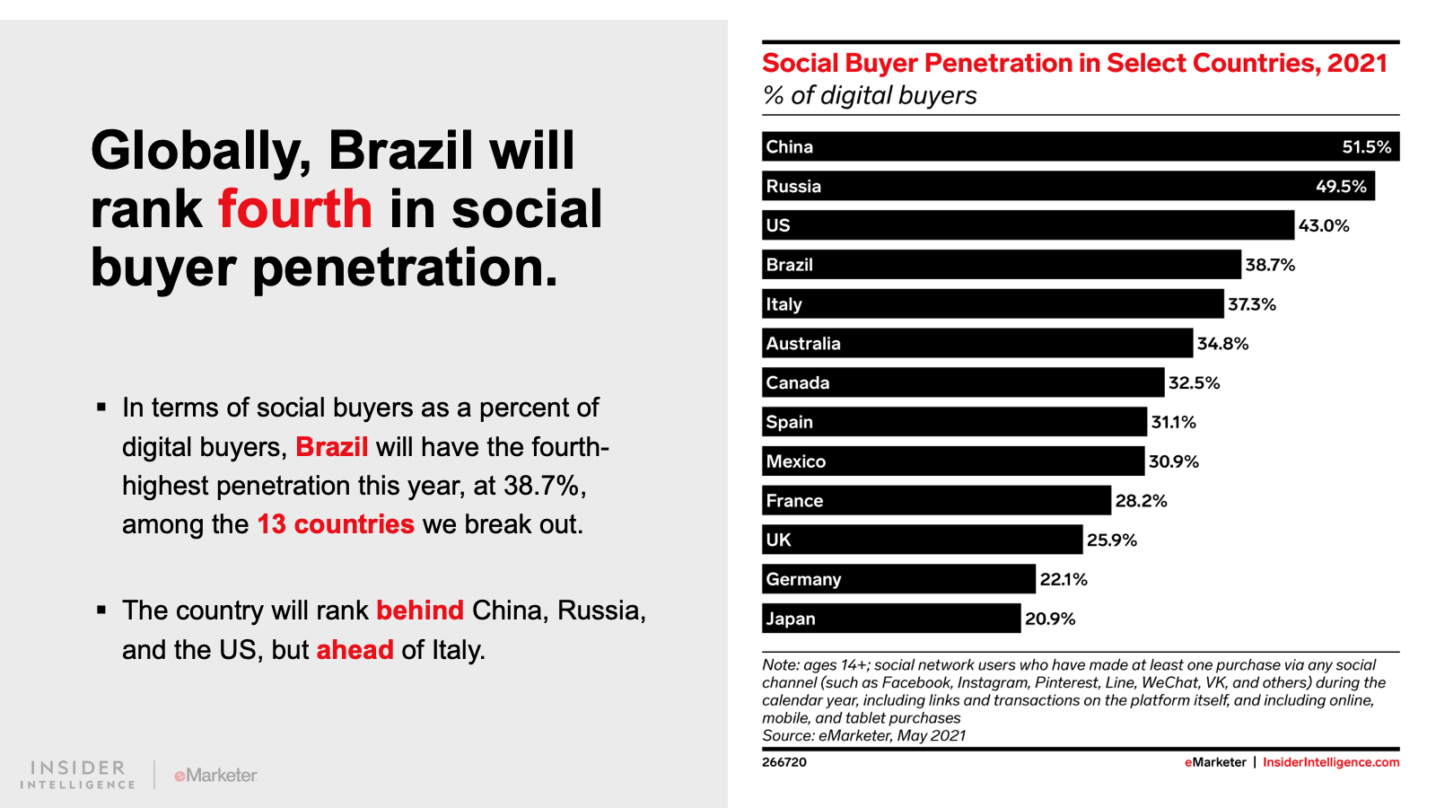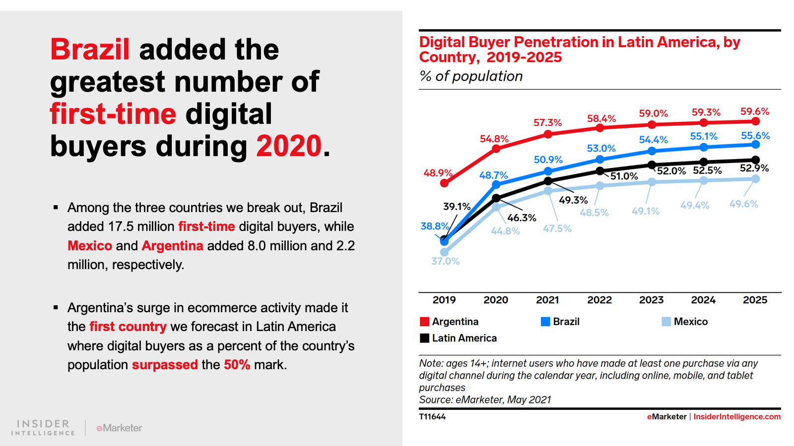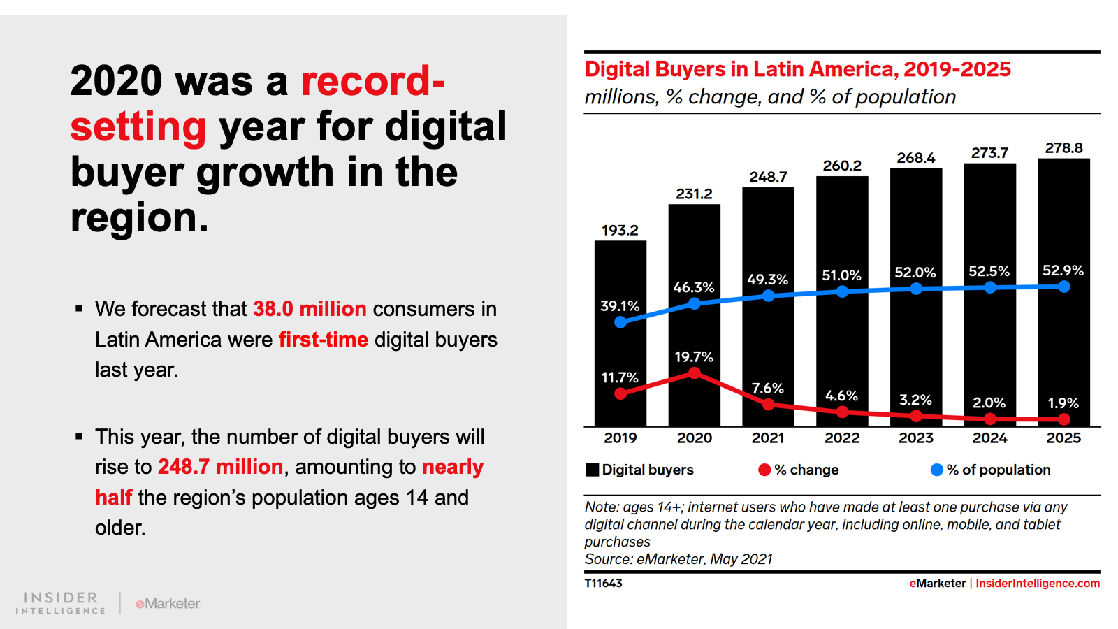 2020 was a record-setting year for digital buyer growth in the region. We forecast that 38.0 million consumers in Latin America were first-time digital buyers in 2020. This year, total digital buyers will rise to 248.7 million, or nearly half the region’s population ages 14 and older.