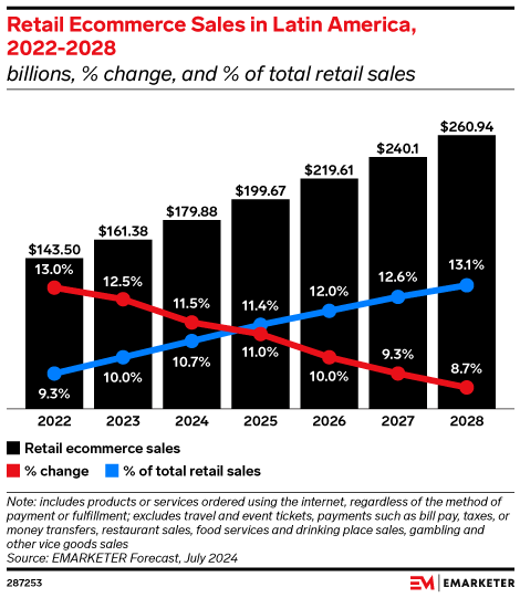 Retail ecommerce sales in Latin America will cross $250 billion by 2028