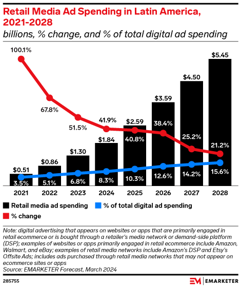 Key Stat: Retail media ad spending in Latin America will triple in size between 2024 and 2028, rising from $1.84 billion to $5.45 billion. At which time, it will represent 15.6% of the region’s digital ad market.