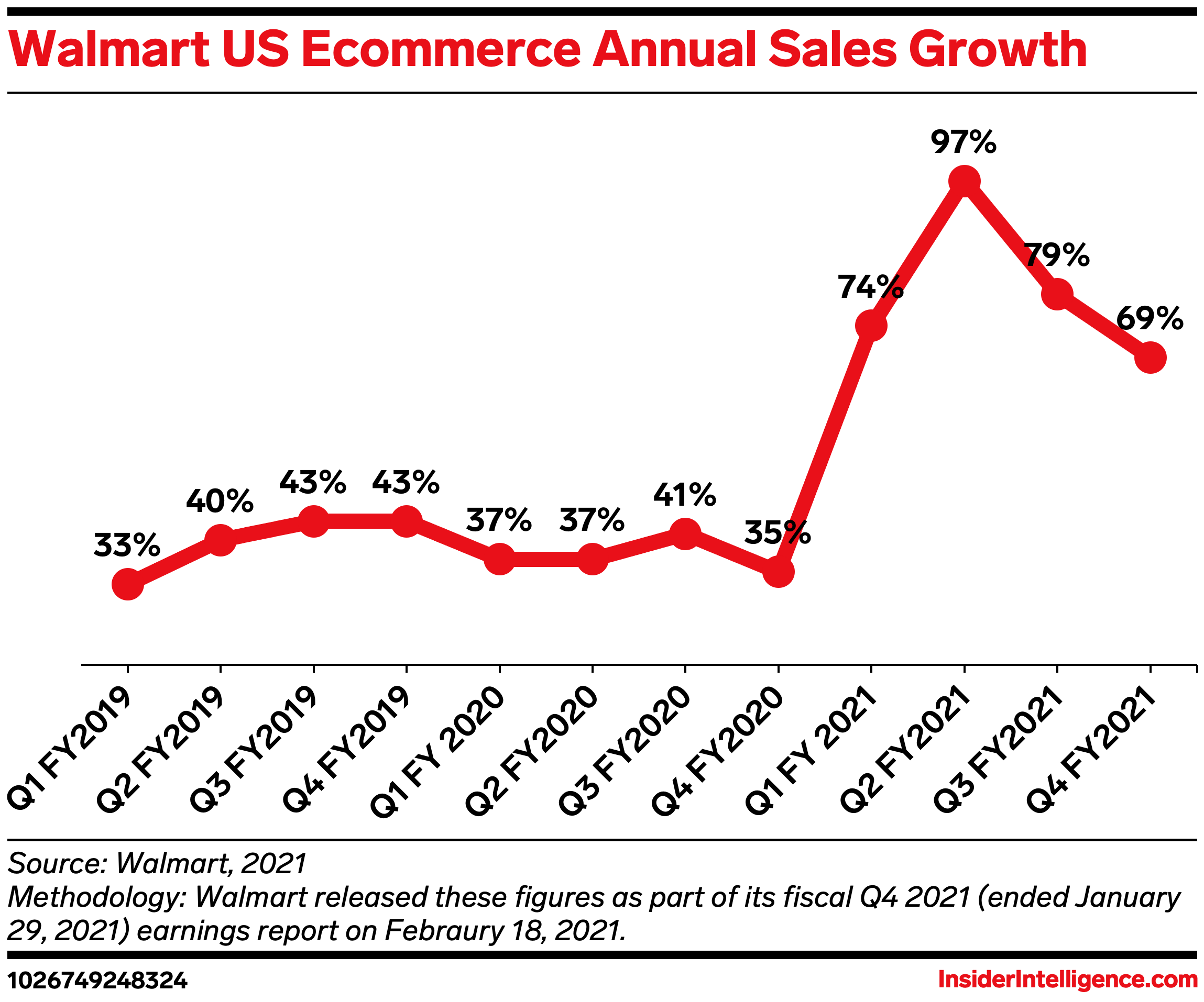 The jump in ecommerce benefited not only Walmart’s business but also that of its competitors—making it harder to hold on to online grocery market share. Despite Walmart’s online sales surging 76% year-over-year (YoY) last year, according to eMarketer forecasts from Insider Intelligence, Amazon and Instacart both saw similar results in 2020 and have been beefing up their offerings to woo customers: Amazon, for example, expanded its in-home grocery delivery service to make it easier and more convenient for customers to order groceries online. Meanwhile, Instacart continues to evolve its business by moving beyond groceries to general ecommerce—stepping further into Walmart’s territory and pushing the retailer to look for ways to enhance its own value proposition and differentiate itself from competitors.