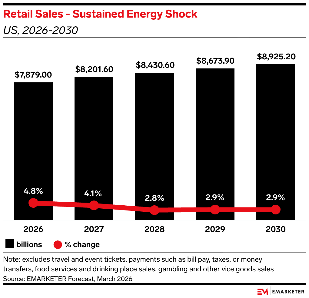 A sustained energy shock would boost top-line US retail sales growth while weakening consumers’ purchasing power, according to EMARKETER’s latest retail scenario forecast.