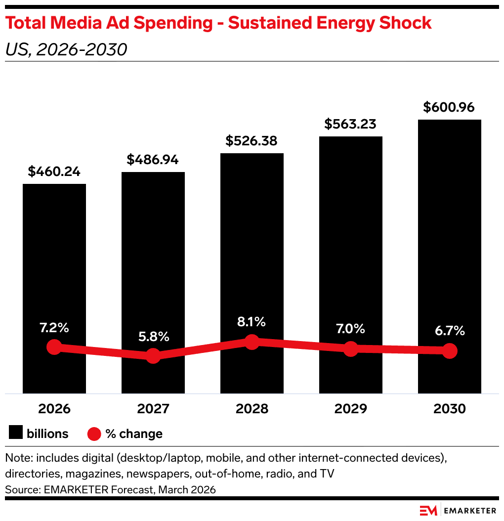 Our forecast lays out two ad spending scenarios: our base-case scenario and one under an extended energy shock. If the Iran war continues to put pressure on global energy supplies, we forecast that US total media ad spend growth will slow to 7.2%, down from 10.8% growth in our base-case scenario. That decline amounts to approximately $16 billion less in ad spend this year. The energy shock scenario leaves the cumulative impact on total US ad spending between 2026 and 2030 at roughly $28 billion below our base case.