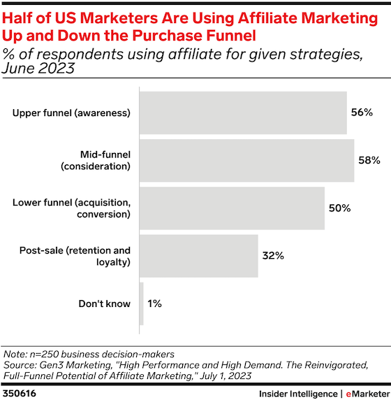Key stat: US marketers are using affiliate strategies throughout the purchase journey, including upper-funnel awareness (56%), mid-funnel consideration (58%), and lower-funnel conversion (50%), per June 2023 Gen3 Marketing data.