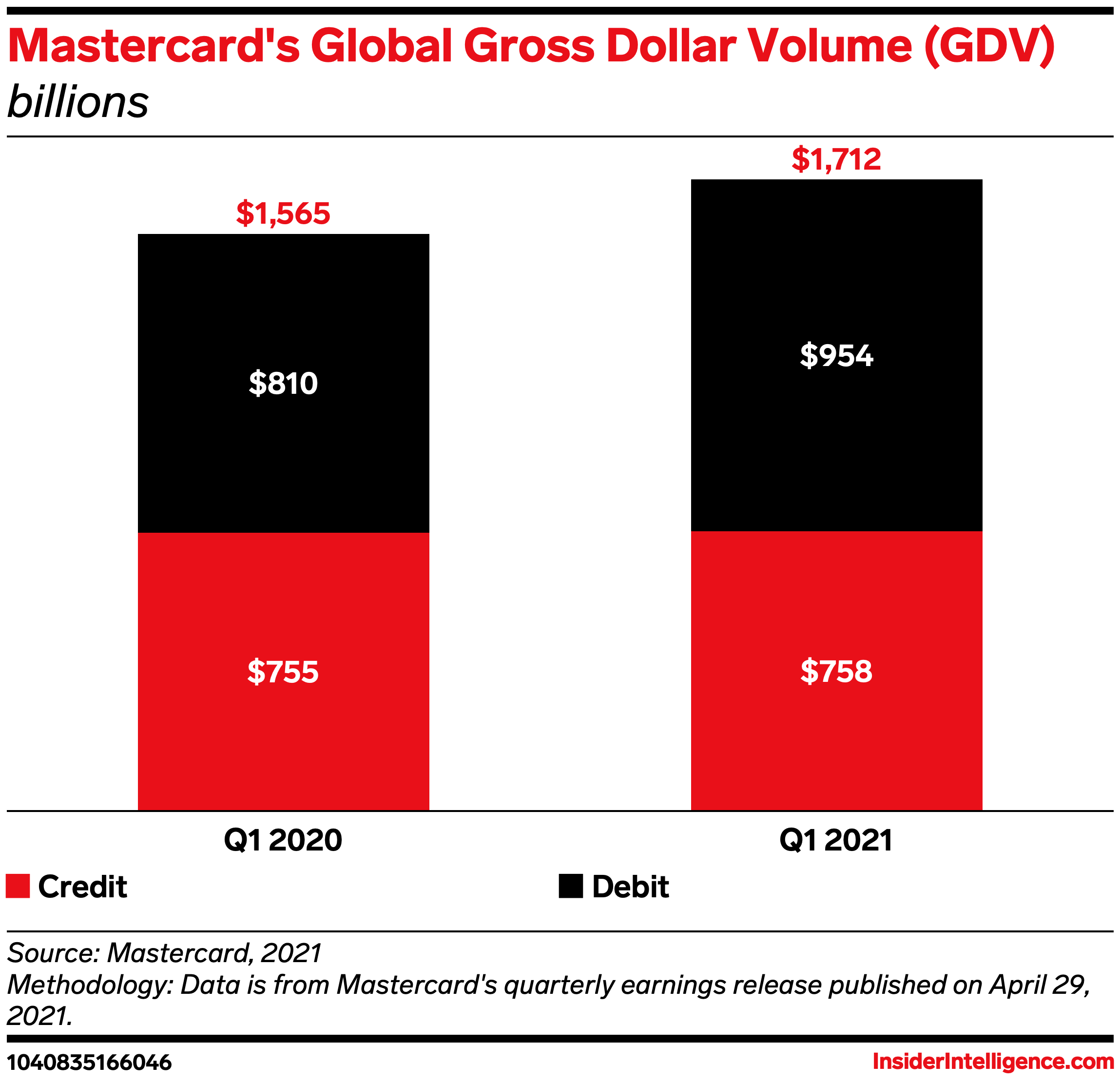 The card network’s Q1 total gross dollar volume (GDV) grew 8% year-over-year (YoY) globally, reaching $1.71 trillion––an acceleration from the 1% growth it saw in the previous quarter. Growth was led by a jump in debit volume, which grew 17.8% YoY and accounted for $954 billion in transaction volume. Credit volume grew less than 1%, hitting $758 billion. But both debit and credit volume improved from the previous quarter: In Q4, global debit GDV grew 8.4% YoY, while global credit GDV declined 6.9%.