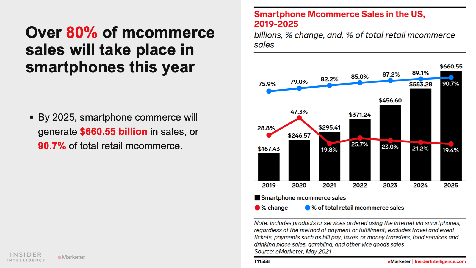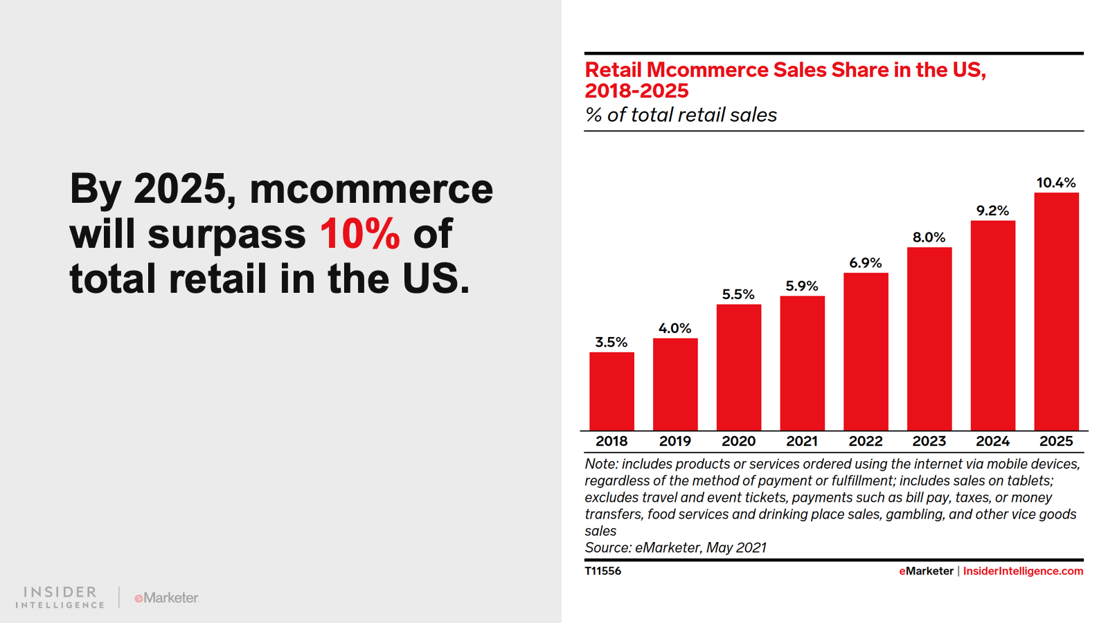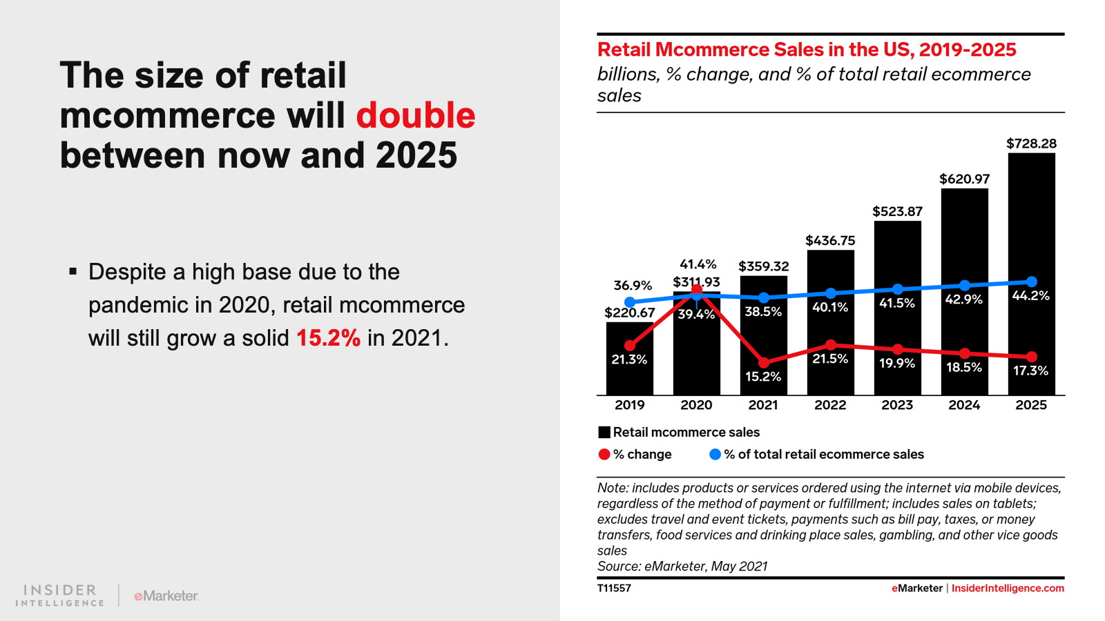 US retail mcommerce sales grew at 41.4% in 2020 and will grow another 15.2% in 2021, to reach $359.32 billion. Annual sales should nearly double between now and 2025.