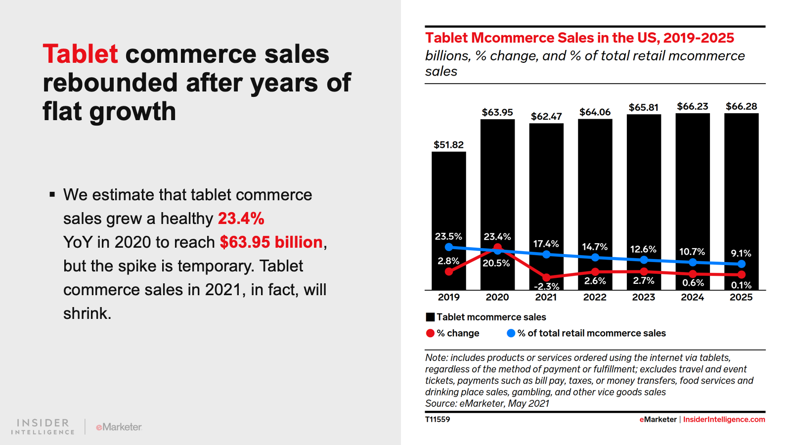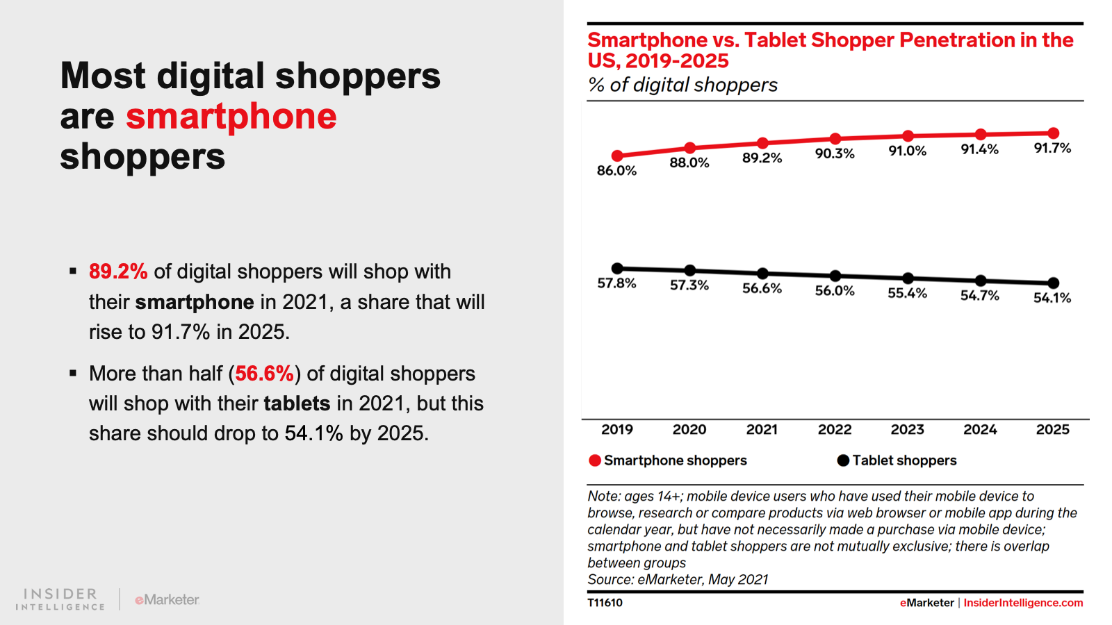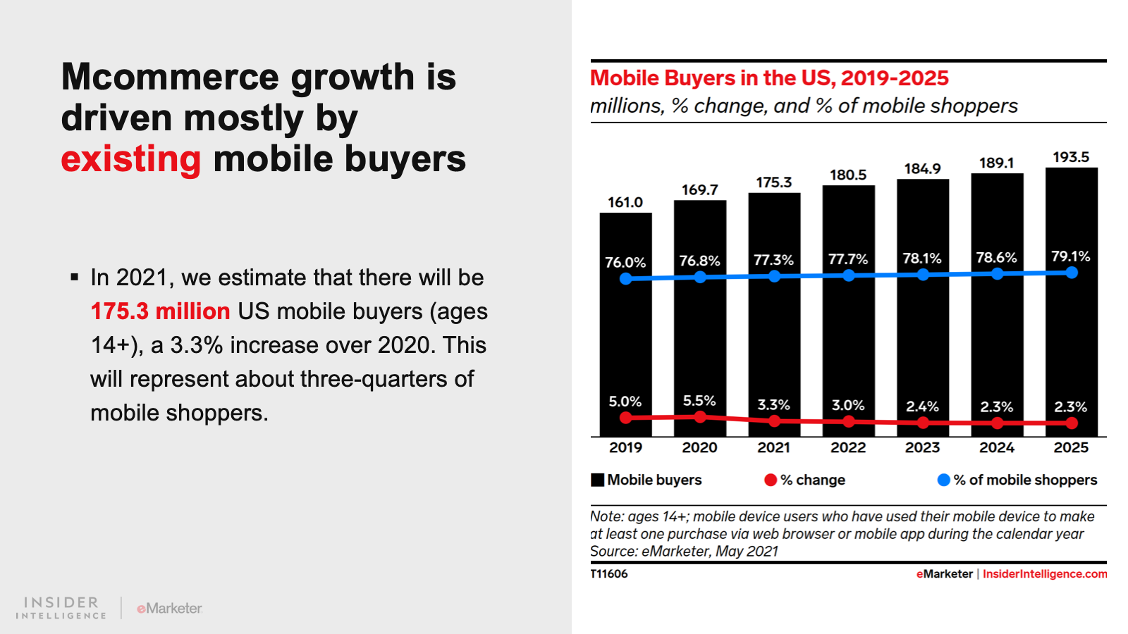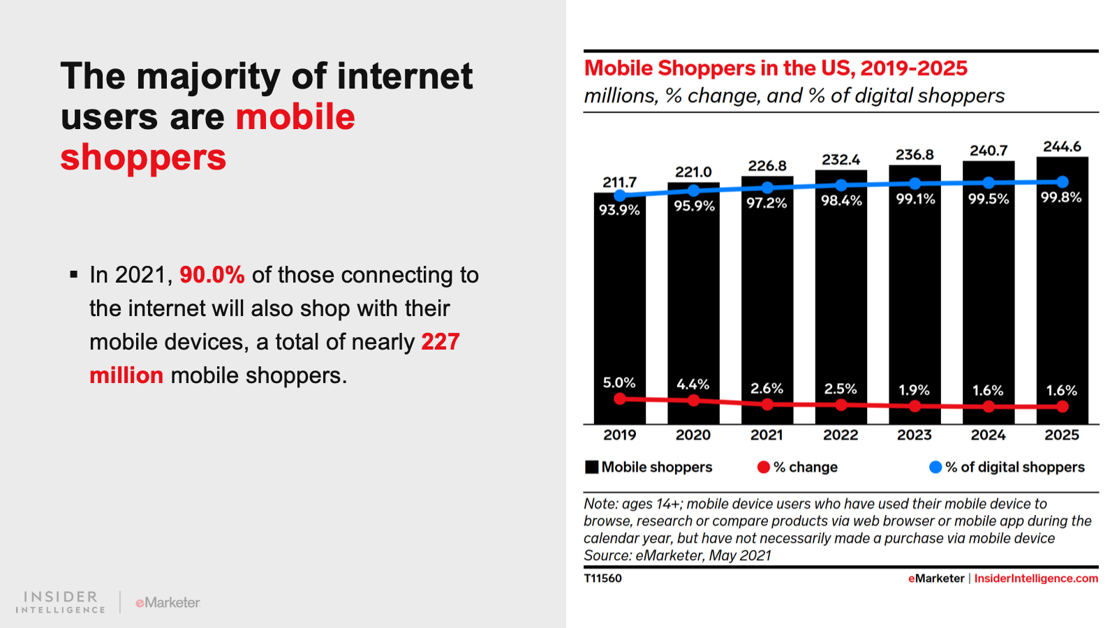 US retail mcommerce sales grew at 41.4% in 2020 and will grow another 15.2% in 2021, to reach $359.32 billion. Annual sales should nearly double between now and 2025.
