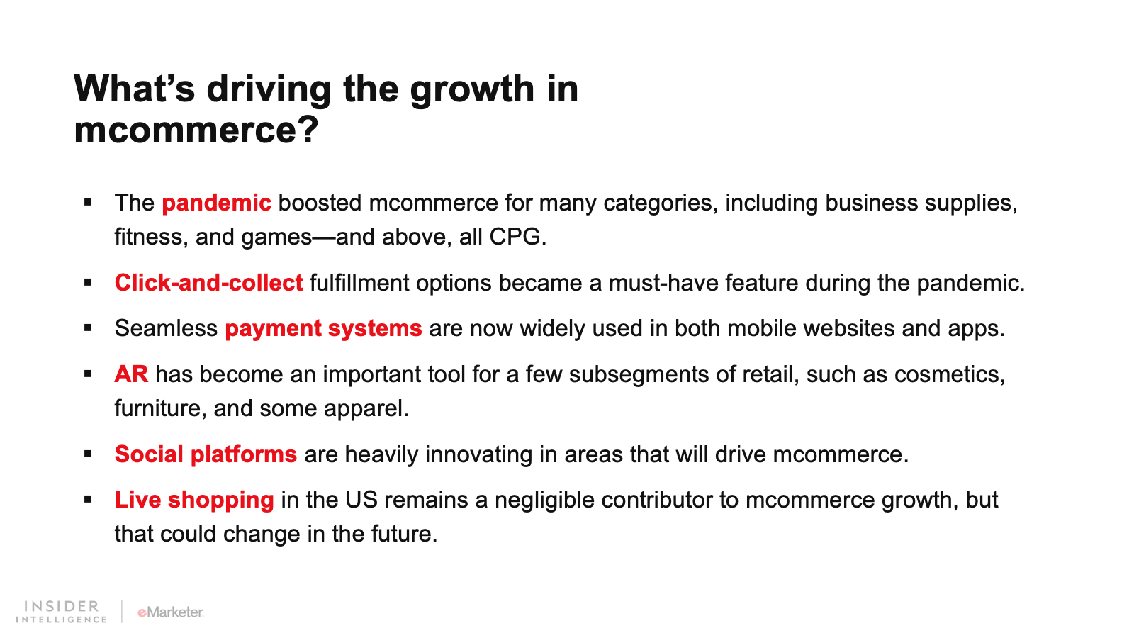 The pandemic accelerated existing trends toward daily purchases, such as consumer packaged goods (CPG), food delivery, and groceries. New technologies, such as AR, 5G, and more seamless buying through one-touch systems like Apple Pay or Google Pay, will continue to drive growth in the future. New channels—including social commerce, live shopping, and influencer direct selling—will also spur growth.