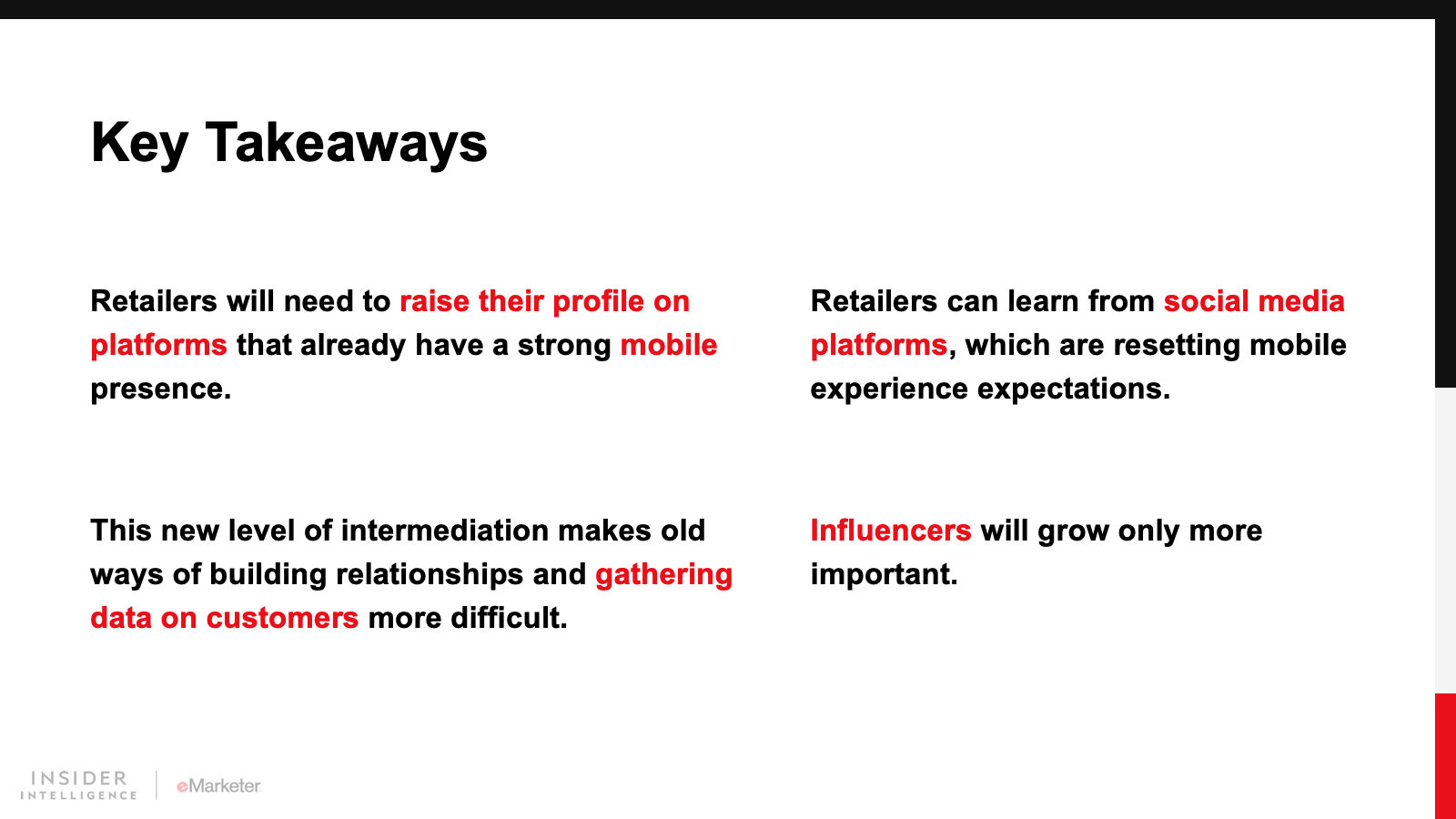 The rapid growth of mcommerce puts it at the center of retail strategies and changes the relationship between retailers and customers. Retailers will need to build relationships with mobile-first platforms, such as social media companies, Google, Instacart, and influencer platforms where mobile audiences are. At the same time, they need to learn how to build a mobile customer experience that increases engagement.