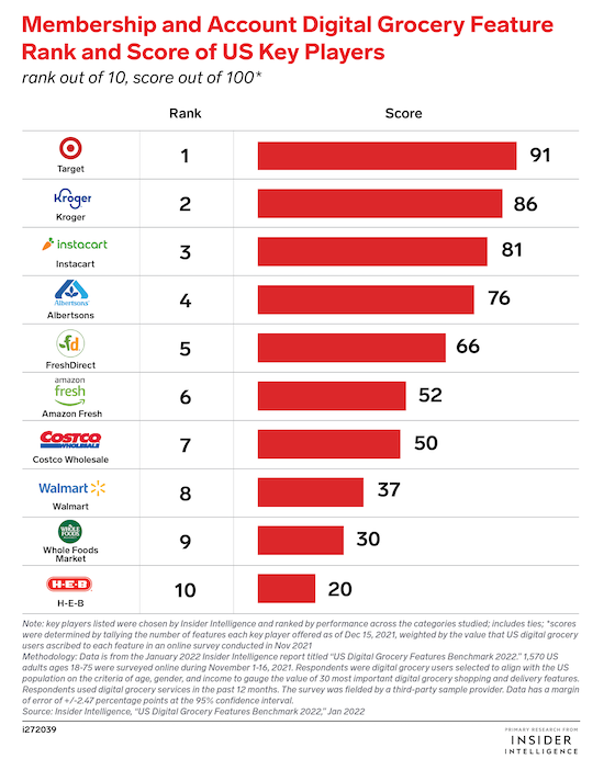 Target offered the most in-demand set of membership and account features. With five of the six features in the category, the retailer scored 91 of 100 points. Kroger and Instacart also offered five of six features, though they were not as in-demand as Target’s offerings.