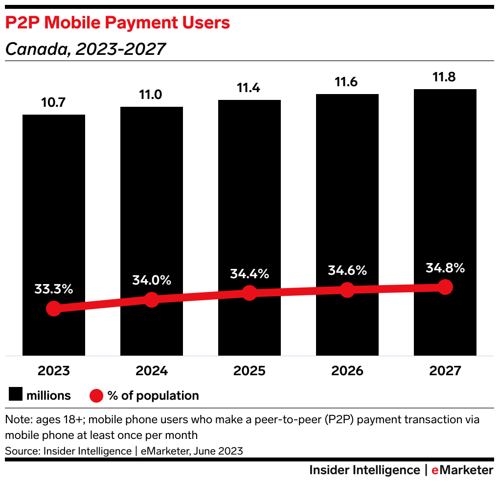 Canadian P2P mobile payments usage will remain low over the next few years as growth peters out. It will plunge from 4.5% in 2023 to just 1.9% in 2027, leaving penetration below 35%.