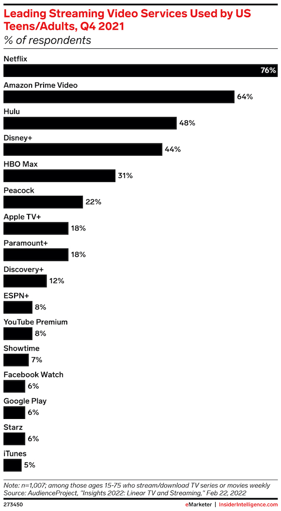 Netflix is practically synonymous with video streaming in the US, with 76% of US teens and adults surveyed using the platform. Amazon Prime Video is the next most popular service, used by 64%, while Hulu, Disney+, and HBO Max round out the top five.