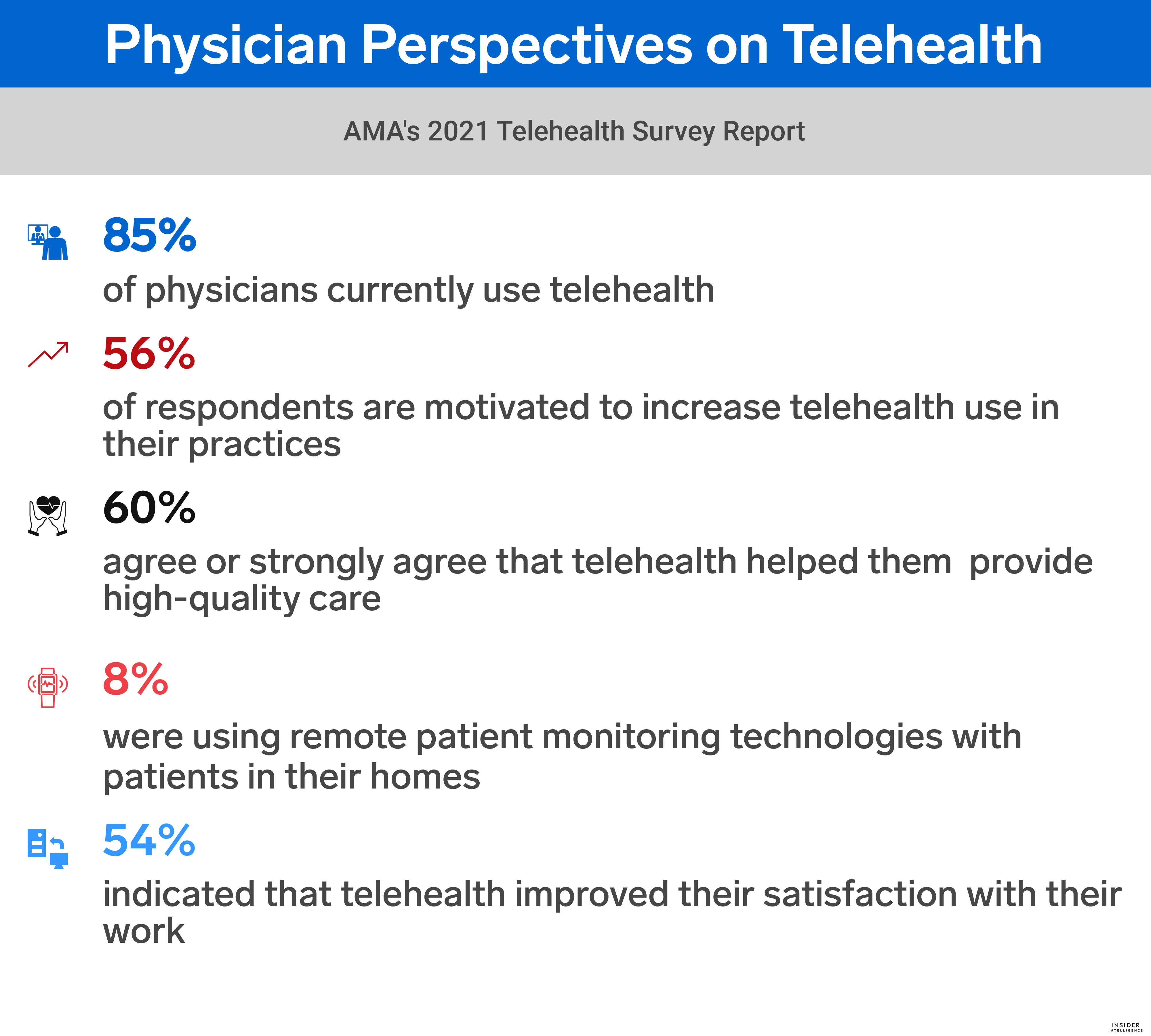 Doctors are mostly using telehealth for medical (72%), chronic disease (68%), specialty care (49%), and mental health (44%) management. Hospital-level care and ED follow-up care are not being delivered as much through telehealth (33%). This underscores the opportunity for hospital-at-home solutions to make virtual hospital-level care more widely possible.