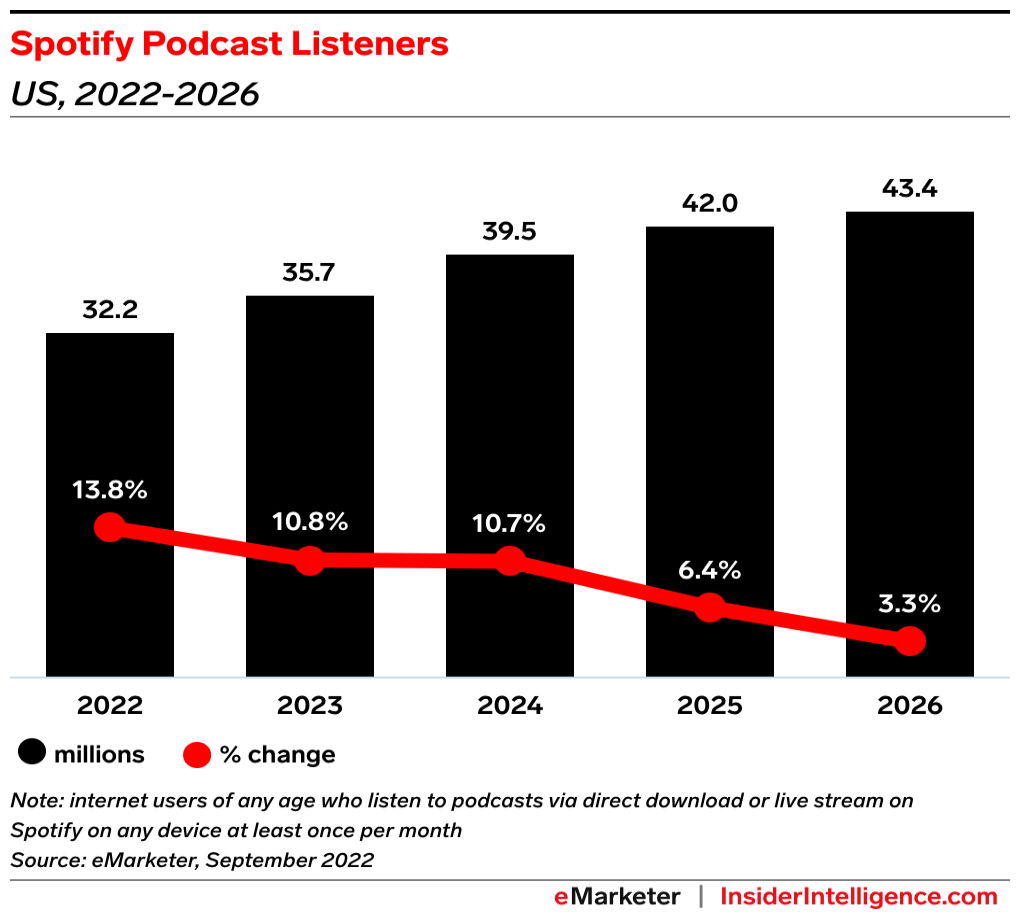 It’s not all bad: While a slower rise in podcast listening this year has affected Spotify, its podcast listeners will increase by 13.8% this year to 32.2 million, outpacing general podcast listener growth (5.0%).