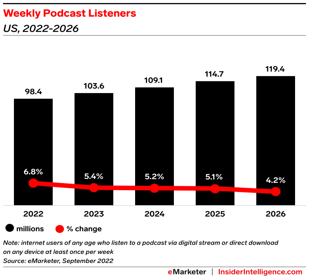 - We estimate that 124.5 million Americans now listen to podcasts monthly. These podcast listeners will rise 5.0% in 2022, just half of the growth rate the channel experienced last year.