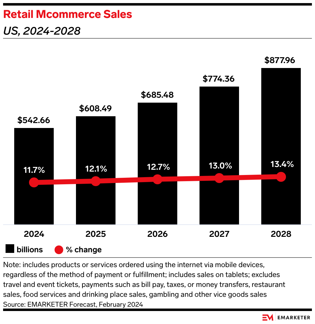 - Meeting those expectations is increasingly important as mobile commerce’s share of online sales continues to grow. We forecast that retail mcommerce sales will account for 44.6% of US ecommerce sales this year. By 2027, we expect that share will approach 50%.