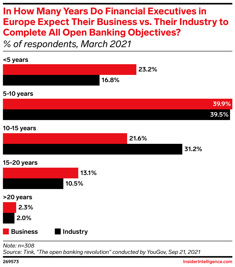 The news: Forty-seven percent of financial services executives said their budgets for open banking technology increased in 2021, per a survey by the open banking platform provider Tink. The survey was based on 308 financial services decision-makers in 12 European countries.