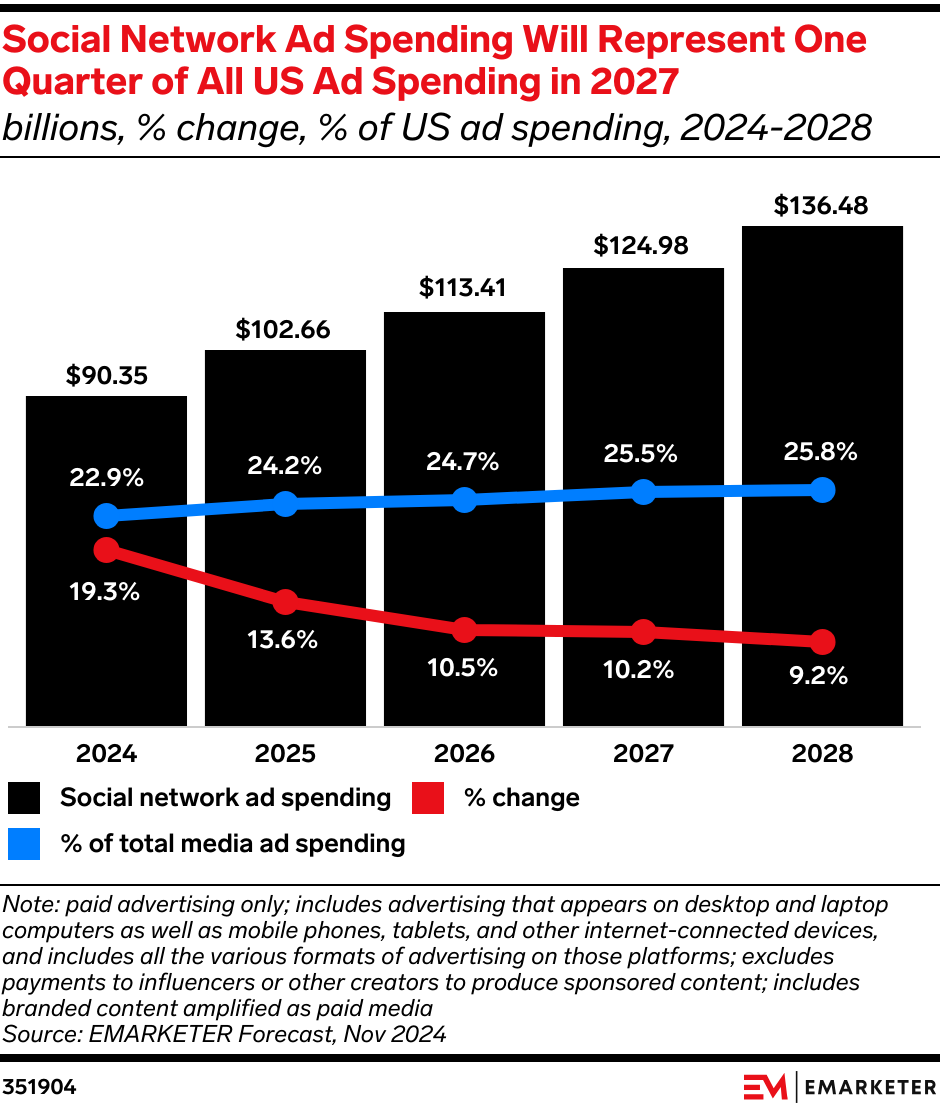 Key Stat: We revised our 2024 US social network ad spending forecast up 9.0% from where it was in H2 2023, after numerous companies handily beat their earnings estimates over the course of 2024.