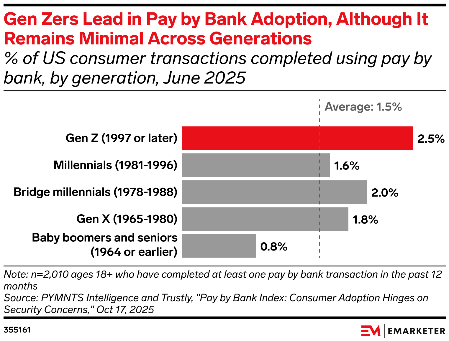 Key Stat: Only 1.5% of all consumer transactions in the US were made via pay by bank in the 12 months ended June 2025, per a PYMNTS and Trustly survey, though Gen Z had the highest rate of usage at 2.5%.