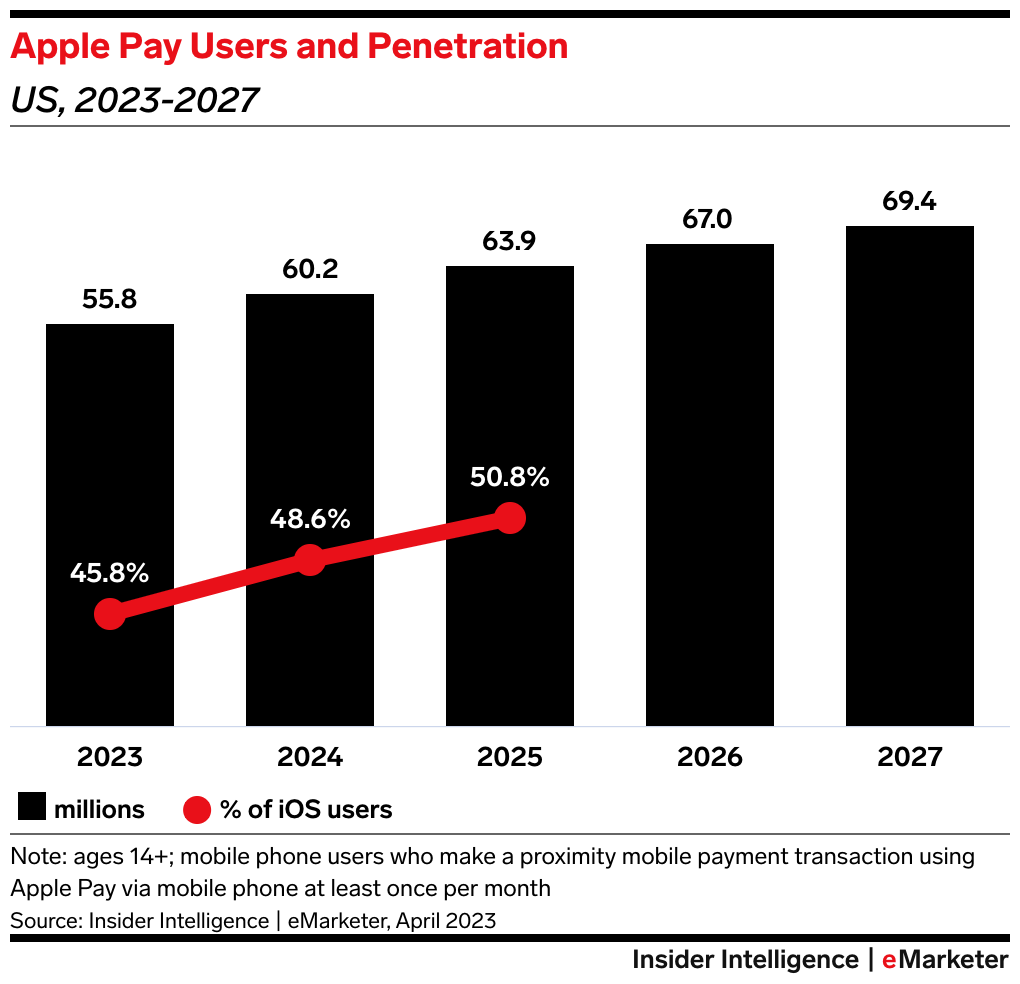 - Using Apple Pay is an entrenched habit for many consumers. We expect 45.8% of iOS users will transact with Apple Pay in 2023, per our forecasts.