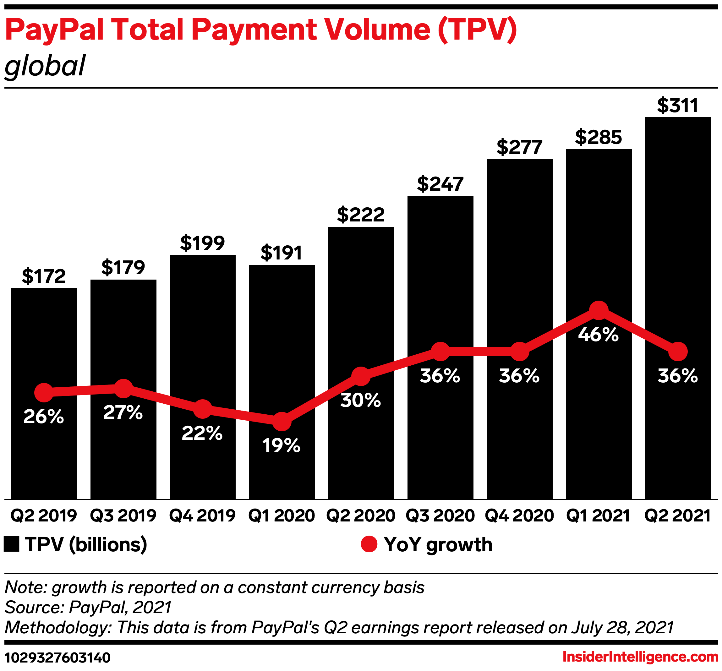 Long-term impact: Pinterest is the third-largest social commerce platform in the US: 5.6% of internet users, or 13.9 million people, will make a purchase on Pinterest in 2021, according to our forecasts. And with US retail social commerce sales expected to hit $36.62 billion in 2021, Pinterest brings with it a massive volume opportunity for PayPal, allowing it to reach Pinterest users earlier in the shopping experience. If the acquisition comes to fruition, it should propel the payments giant’s growth: In Q2, PayPal’s total payment volume (TPV) shot up 36% year over year (YoY), hitting $311 billion.