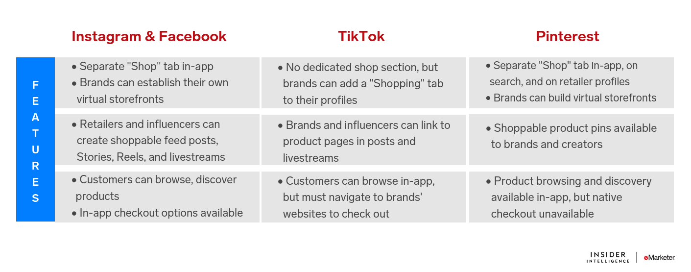 - While many platforms offer some form of shoppable content, only Facebook and Instagram currently have in-app checkout options. Lacking native checkout abilities is not necessarily a deal breaker for consumers—56% of US shoppers who made a purchase through social media did so via links to retailers’ websites, according to a survey from Bizrate Insights—but the more seamless the process is, the more likely shoppers are to see the transaction through to the end.