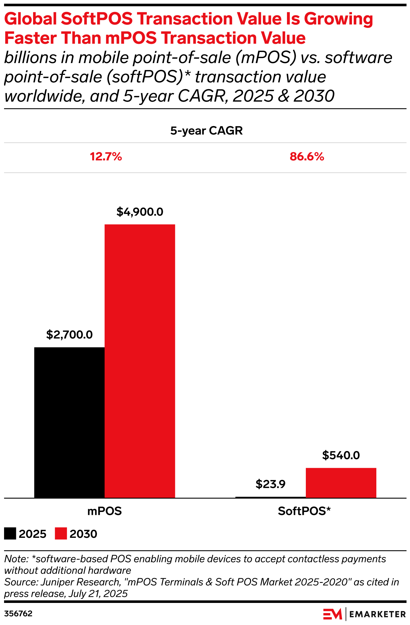 Key Stat: Global software point-of-sale (softPOS) transaction value will accelerate approximately six times faster than mobile point-of-sale (mPOS) transaction value growth over the next five years to reach $540 billion in 2030, per Juniper Research.