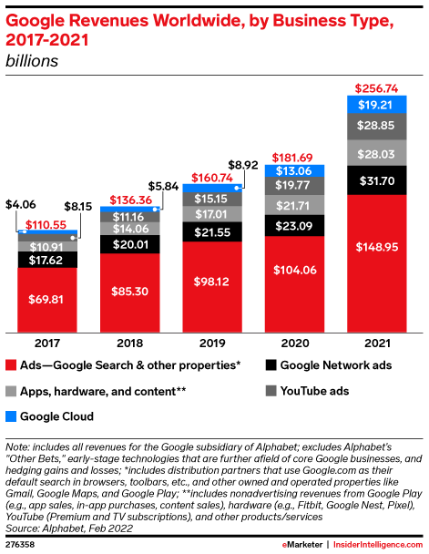 KEY STAT: Google’s advertising business grossed $209.5 billion in 2021, according to its filings, and remains the largest portion of Alphabet’s revenues by far.