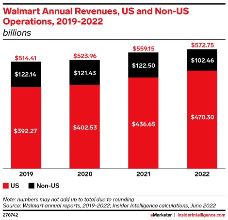 KEY STAT: Walmart’s fiscal 2022 revenues were up 2.4% from the previous year, reaching $572.75 billion. US revenues, bolstered by strong ecommerce sales and exploding Walmart Connect business, offset softness in the international markets.