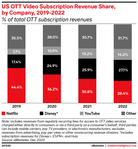 In 2021, just under a third (30.8%) of all US OTT subscription revenues will go to Netflix. Disney will account for about one-fourth (25.9%) of OTT subscription revenues in the US, and YouTube will account for 13.2%.