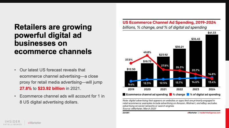 Our latest forecast for ecommerce channel advertising—a close proxy for retail media advertising—projects that spending will increase by 27.8% year over year to reach $23.92 billion in 2021. Expect this forecast to be revised upward in the fall as a result of Amazon and Walmart posting much higher growth for their respective ad businesses in recent earnings reports.