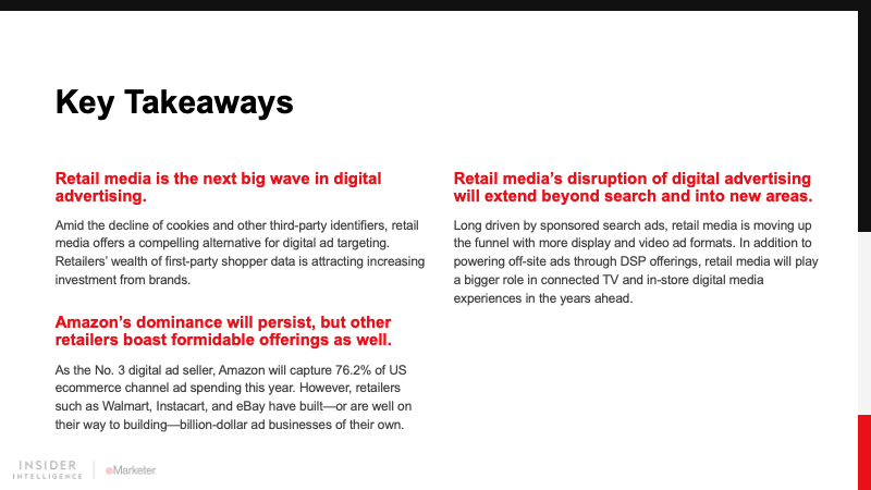 Retailers have vast amounts of customer data that’s highly valuable to advertisers, since that data can help target ads based on a shopper’s likelihood to make a purchase and measure results in a closed loop. We expect advertisers to continue increasing their investments in retail media to access these benefits.