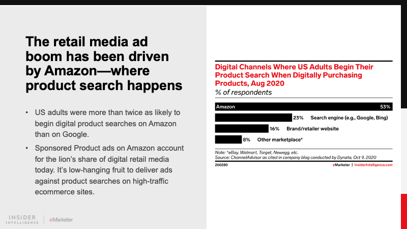 Historically, retail media has been driven by bottom-funnel sponsored search ads on retailers’ ecommerce websites. Recent emphasis on upper-funnel display and video ads, as well as the use of demand-side platforms (DSPs) to deliver ads across the open web, points to what’s ahead.
