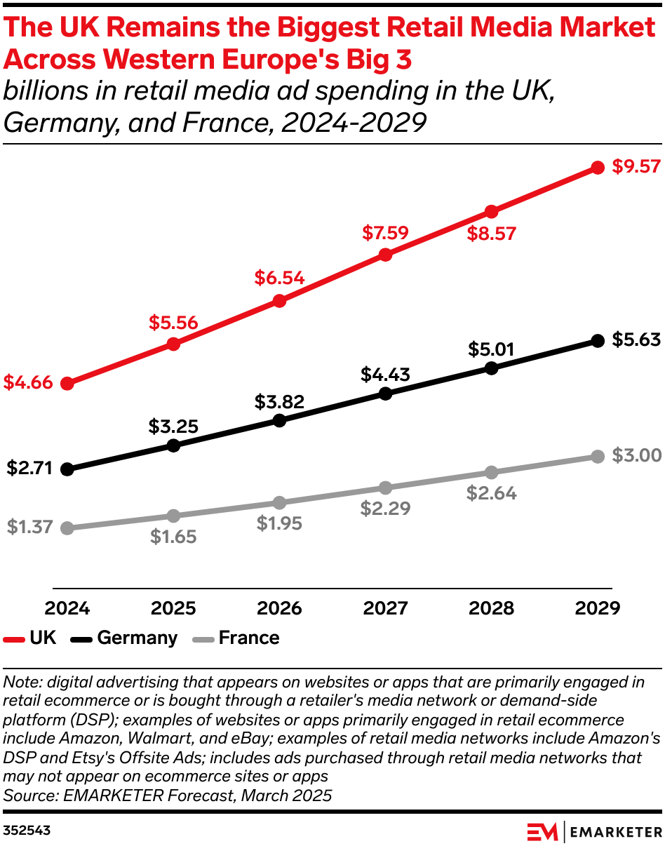Key Stat: The UK is the biggest market in Western Europe for retail media ad spending by some distance. This will remain the case throughout our forecast, with outlays set to approach $10 billion by 2029.