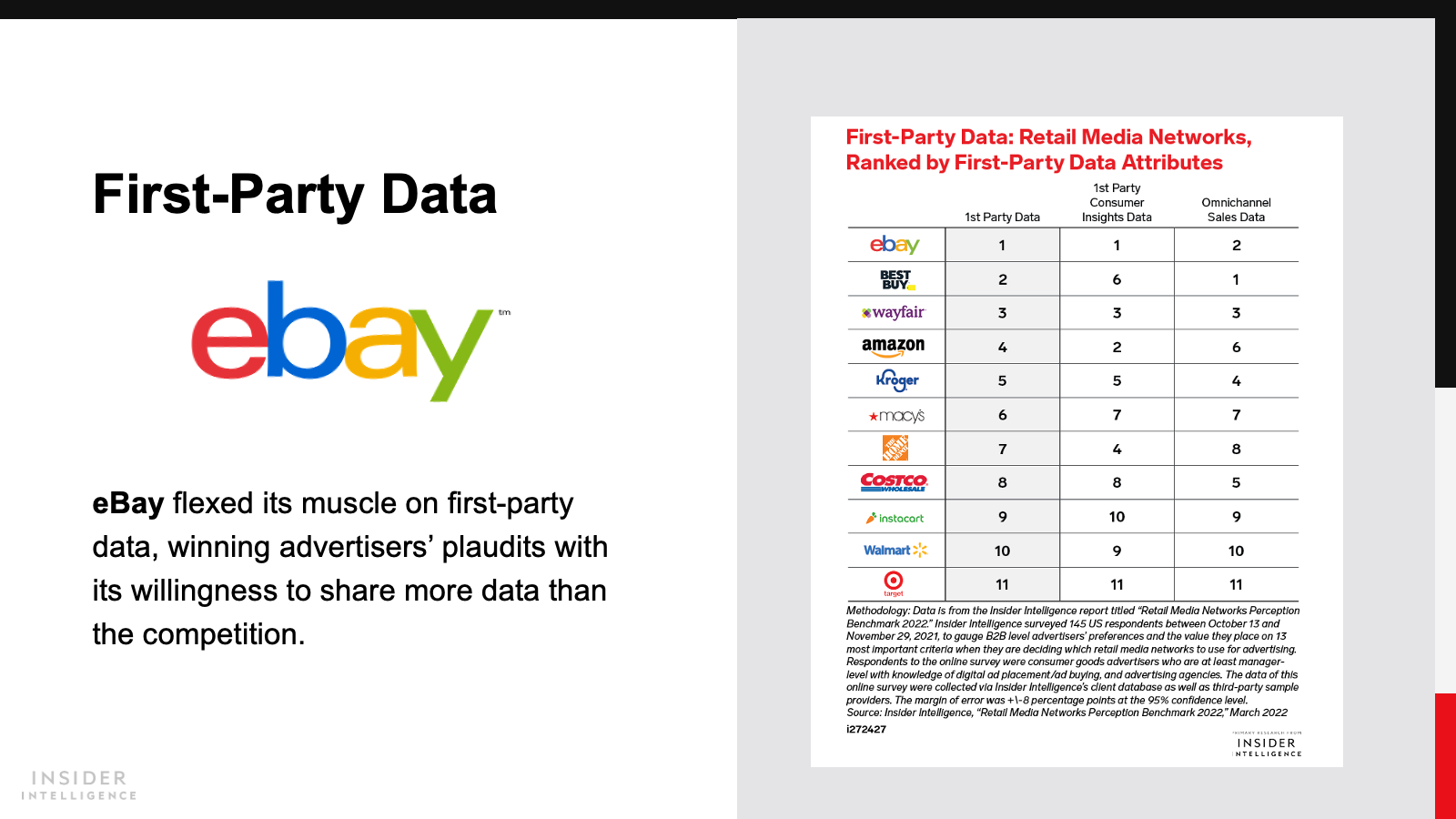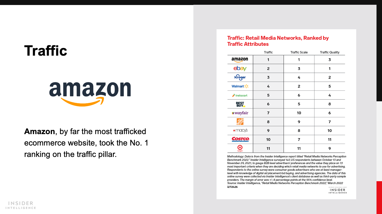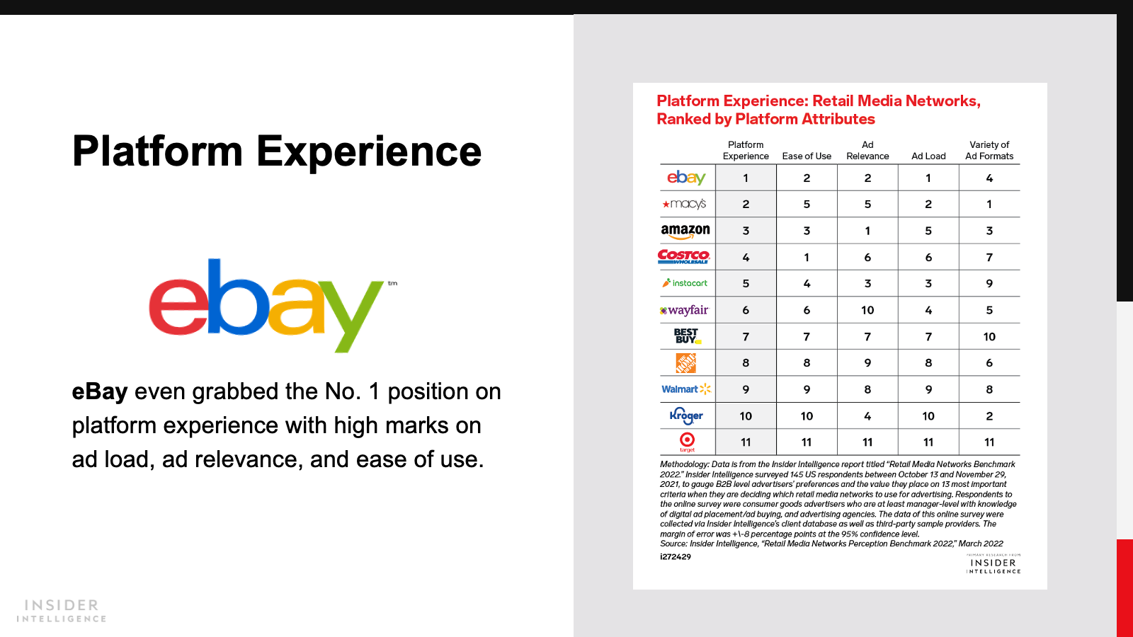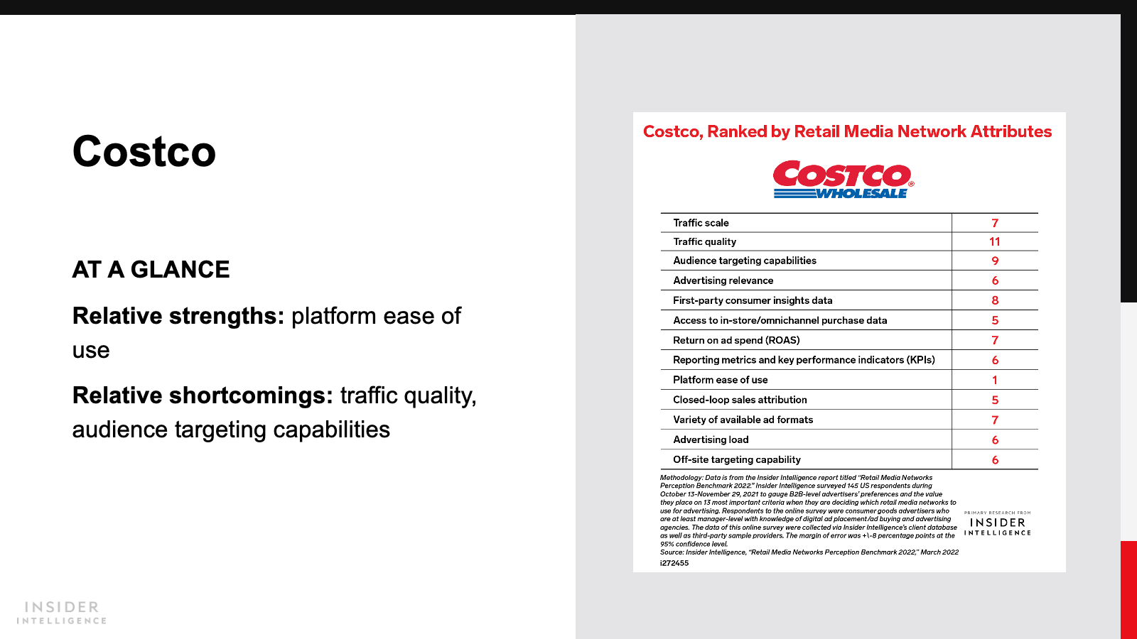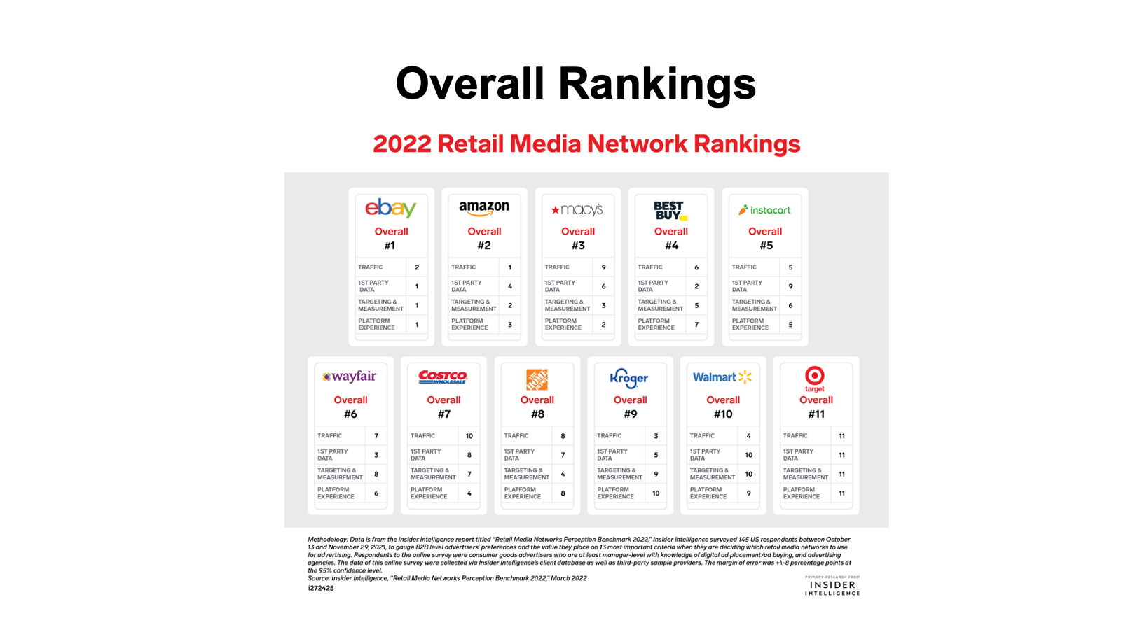 Here’s how ad buyers ranked the retail media networks of 11 major retailers—Amazon, Best Buy, Costco Wholesale, eBay, The Home Depot, Instacart, Kroger, Macy’s, Target, Walmart, and Wayfair—according to the attributes they value most.
