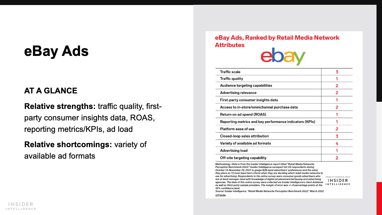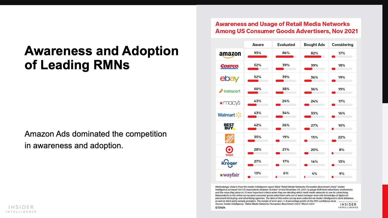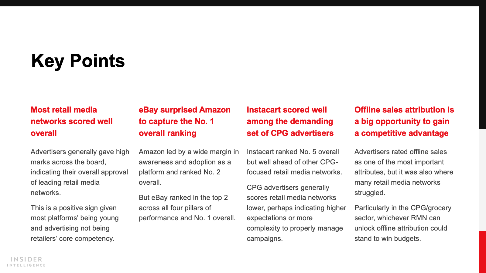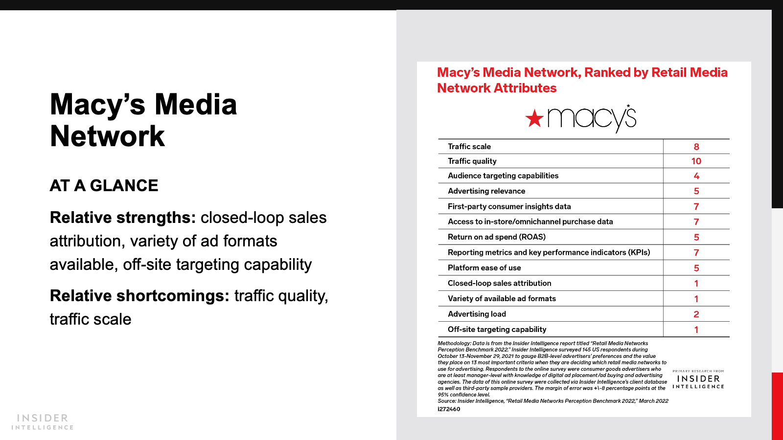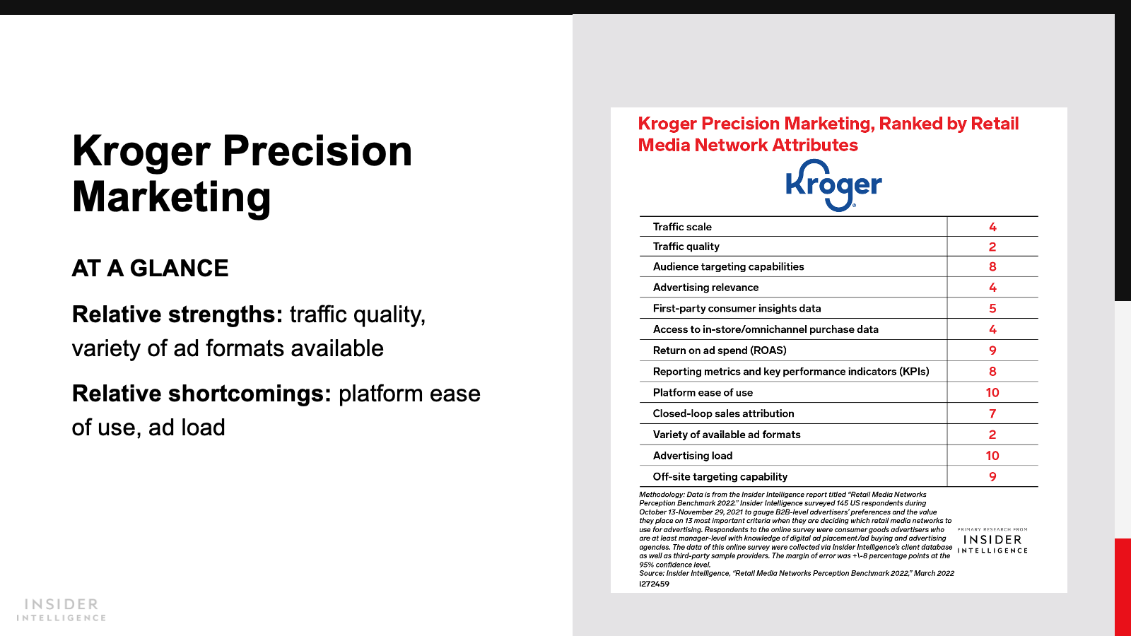 Here’s how ad buyers ranked the retail media networks of 11 major retailers—Amazon, Best Buy, Costco Wholesale, eBay, The Home Depot, Instacart, Kroger, Macy’s, Target, Walmart, and Wayfair—according to the attributes they value most.