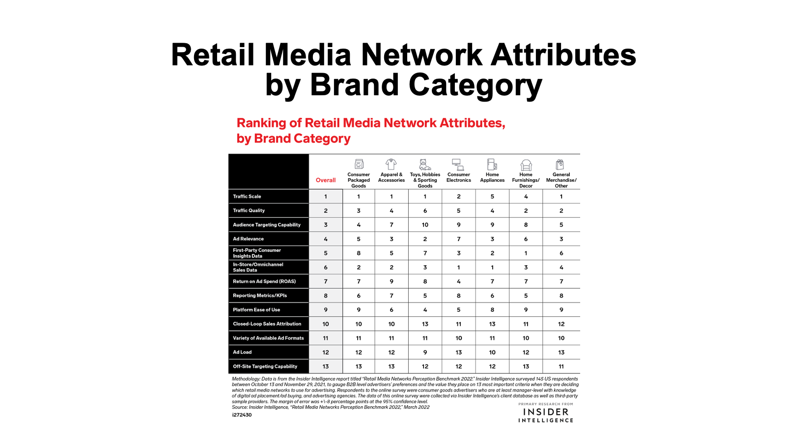 WHAT’S IN THIS REPORT? An analysis of the most important attributes of retail media networks to digital ad buyers and a ranking of the 11 leading retail media networks.