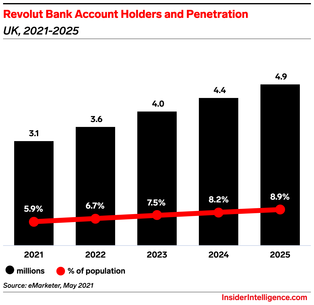 - Revolut could face an uphill battle in its global expansion.The gigantic fundraise should alleviate the lack of resources that precipitated its retreat from Canada. But fierce competition and a lack of customer awareness outside of the UK could imperil Revolut’s planned expansion. Revolut still relies heavily on its primary market, even as it pushes abroad: 88.42% of its 2020 revenue came from the UK, 10.24% was generated in the European Economic Area, and just 1.34% came from all other markets. As the neobank goes deeper into North America, it could collide head-on with US-based challengers that are experiencing their own growth spurts. Chime is expected to reach 20.2 million account holders by the end of 2021, and Current is forecast to more than double its user base to 8.4 million by 2025. So while this latest funding round gives Revolut the firepower necessary to introduce its product suite to new geographies, in an important market like the US, it may arrive too late to the party.