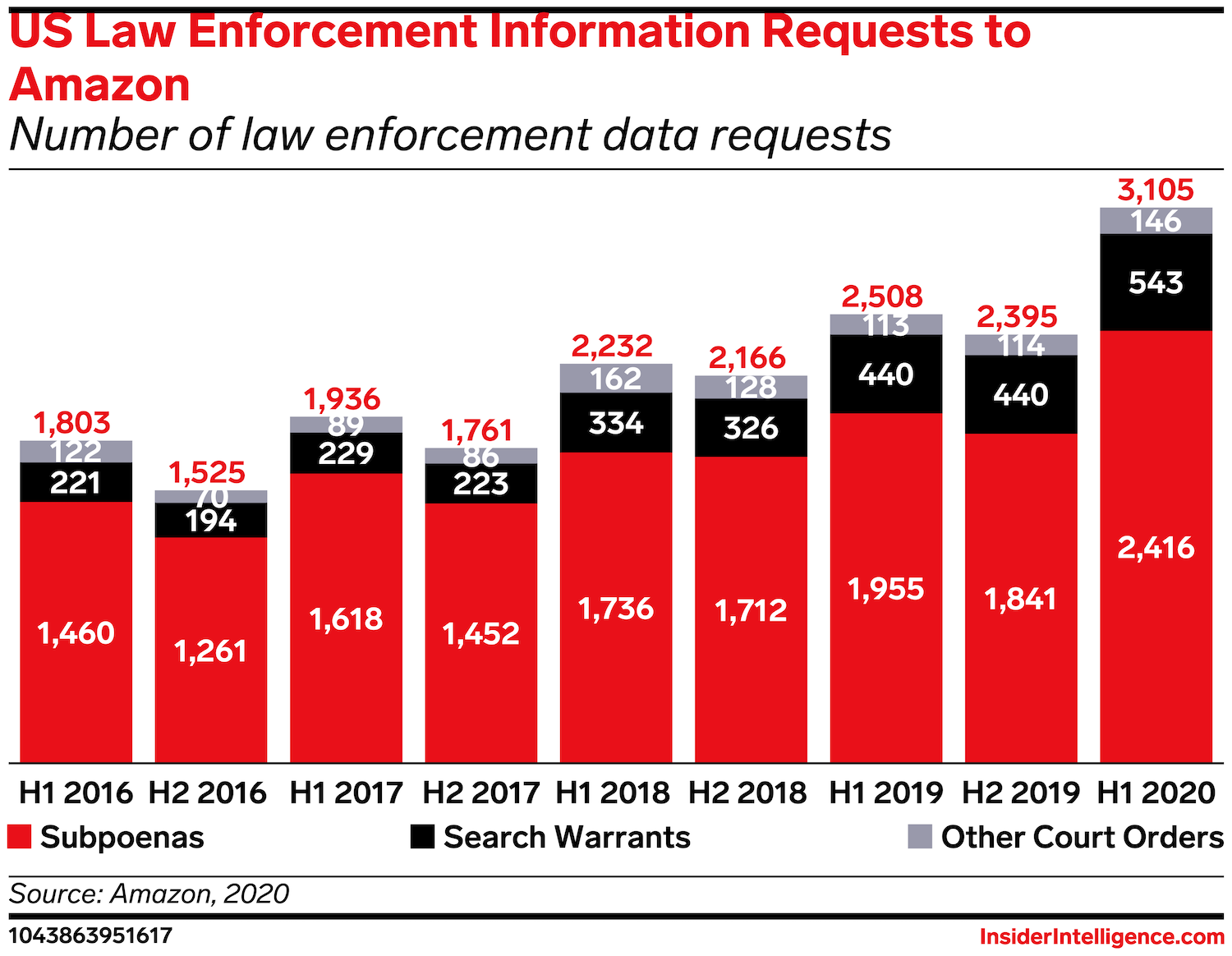 - In the first half of 2020, Amazon received a record number of information requests (3,105) from US law enforcement, comprising subpoenas, search warrants, and court orders.