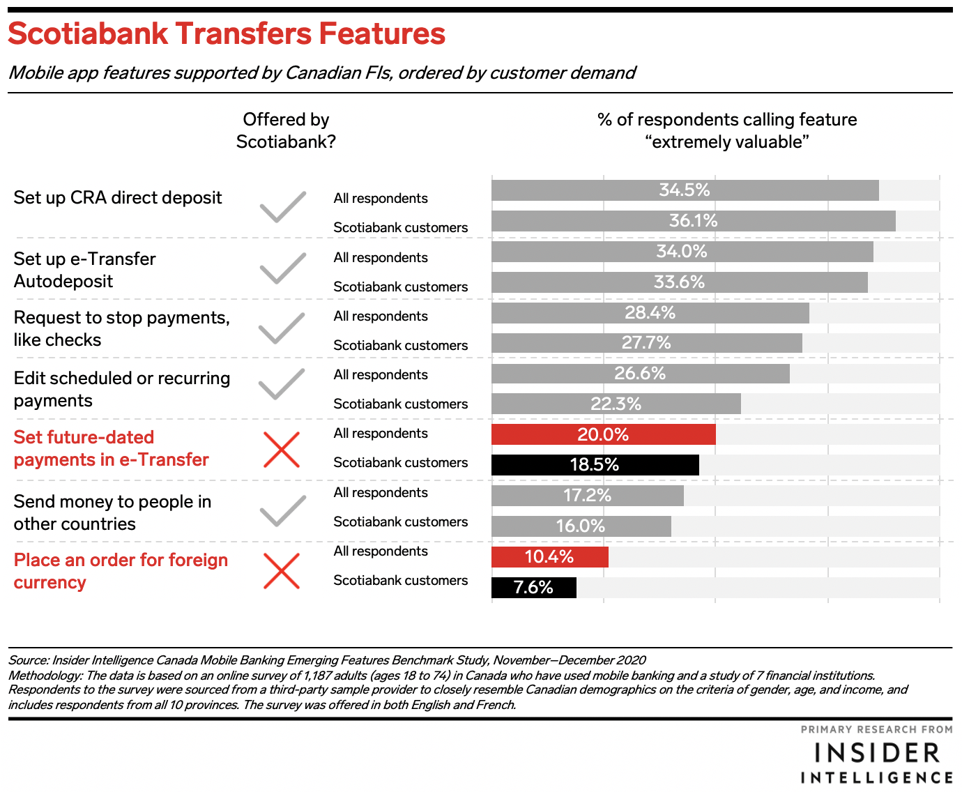 WHAT’S IN THIS REPORT? This report features findings from the inaugural Insider Intelligence Canada Mobile Banking Emerging Features Benchmark Study, which analyzes the mobile apps of the seven largest FIs according to the availability of 42 mobile features. Here, we focus on Scotiabank’s mobile offering through the lens of customer demand data.