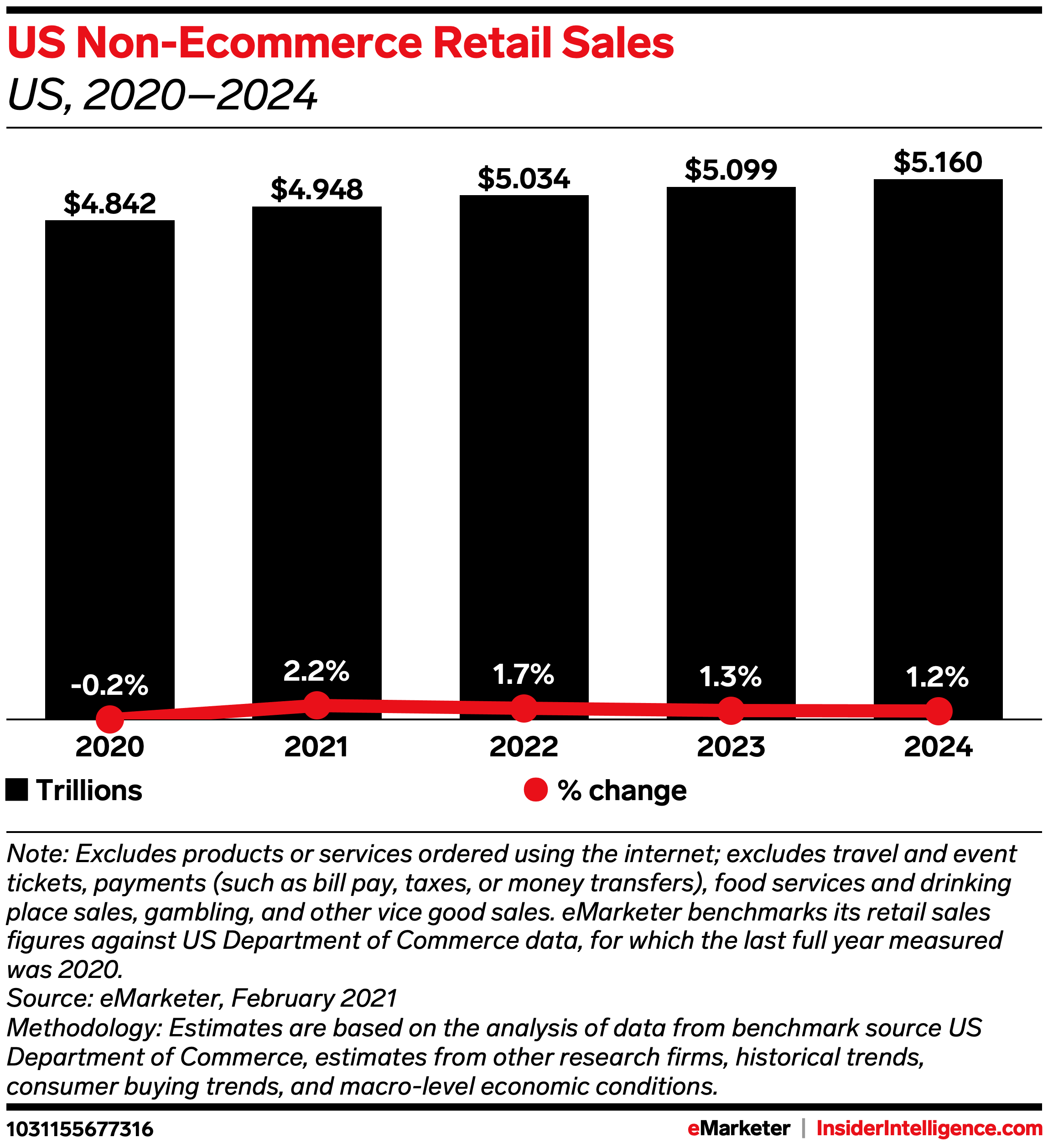 Bringing Amazon One into more stores lets the etail giant market its tech solutions to retailers—an initiative it’s been pushing for the last year. Amazon has been focusing more on in-store retail, specifically on building solutions that it can license out to brick-and-mortar businesses, as a growth opportunity—likely because the majority of US retail sales still occur offline. The etailer also has Just Walk Out, its autonomous checkout solution that it says can be used in stores, stadiums, and other venues. And recently, Amazon announced the launch of its first hair salon, which will feature augmented reality and point-and-learn technology—an offering that lets customers point to a product on a display shelf to bring up product information, brand videos, and tutorials on a nearby display—which it could license out to businesses in the beauty industry. Similarly, bringing Amazon One into Whole Foods locations lets the etailer prove the technology’s utility, which might encourage merchants to use the offering in their own stores.
